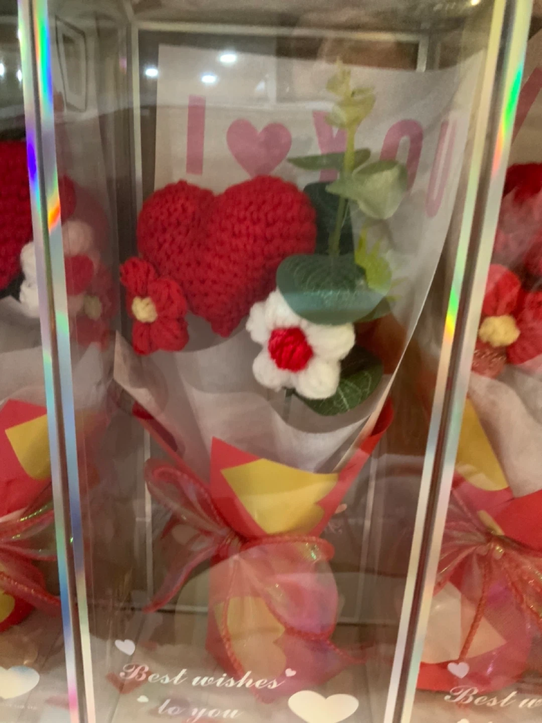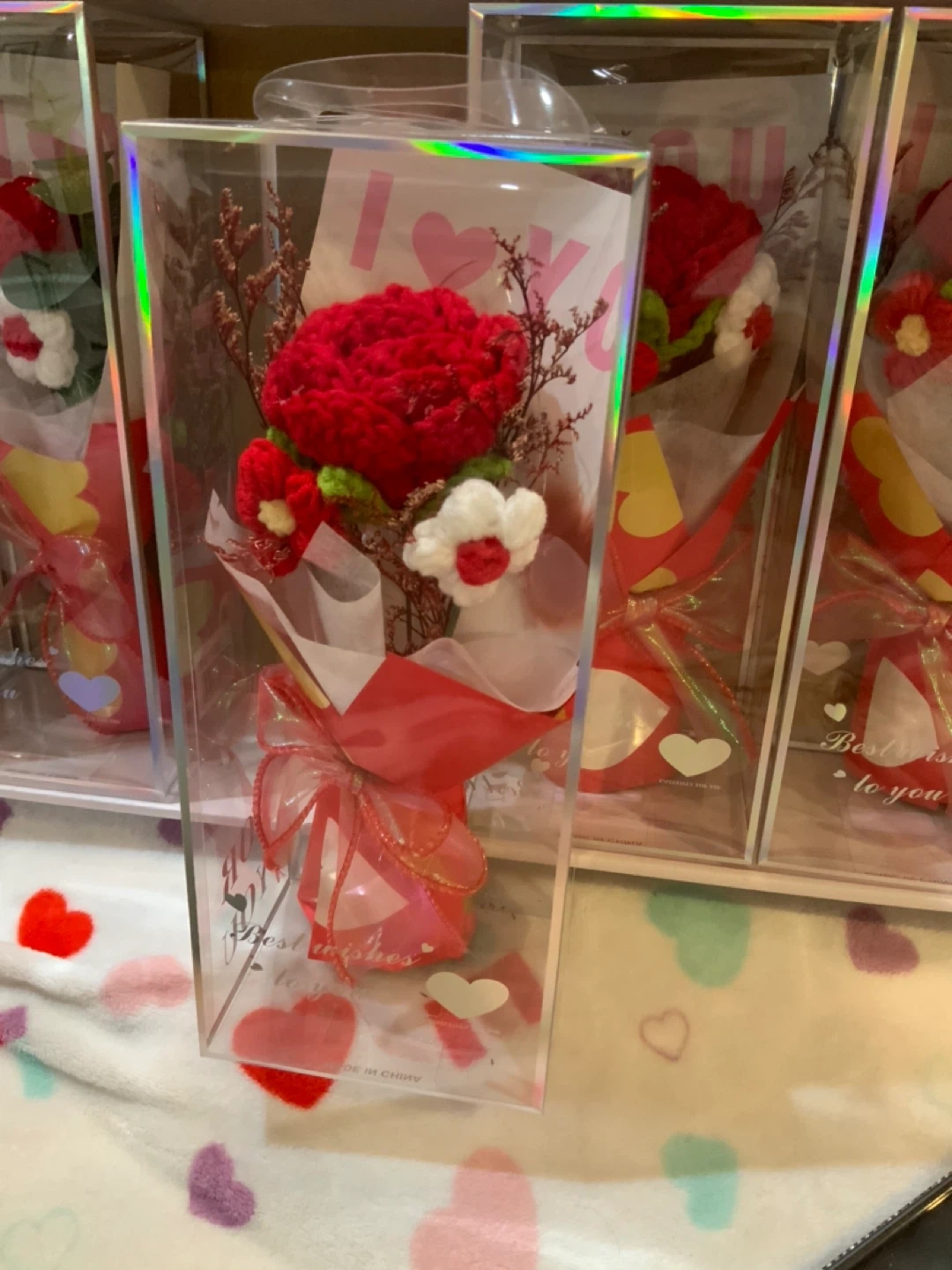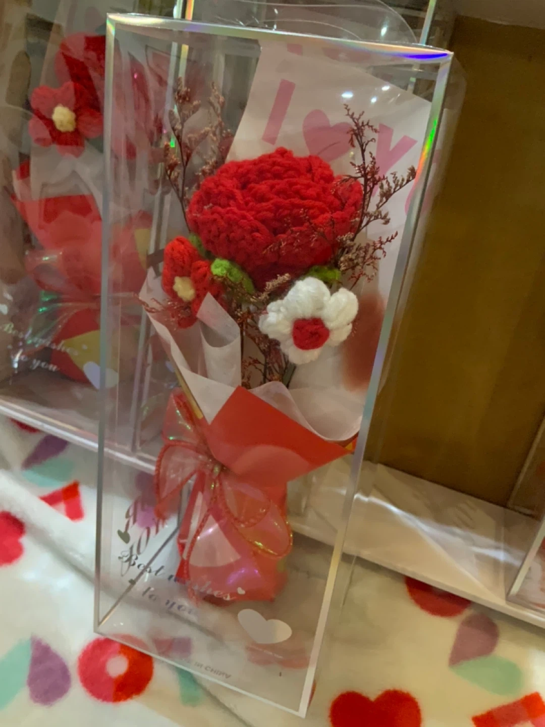 This is a cute crocheted flower bouquet presented in a clear gift box. It features red and white crocheted flowers with green leaves and some dried filler. The bouquet is tied with a red ribbon and bow. It's ready for gifting! $10 each