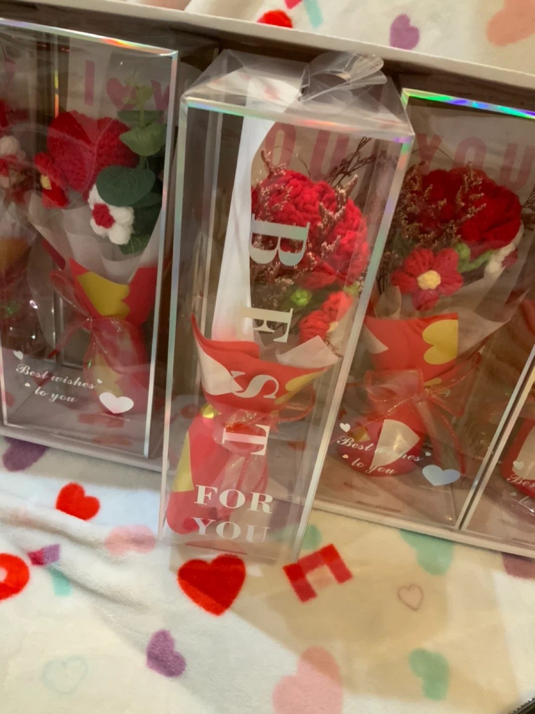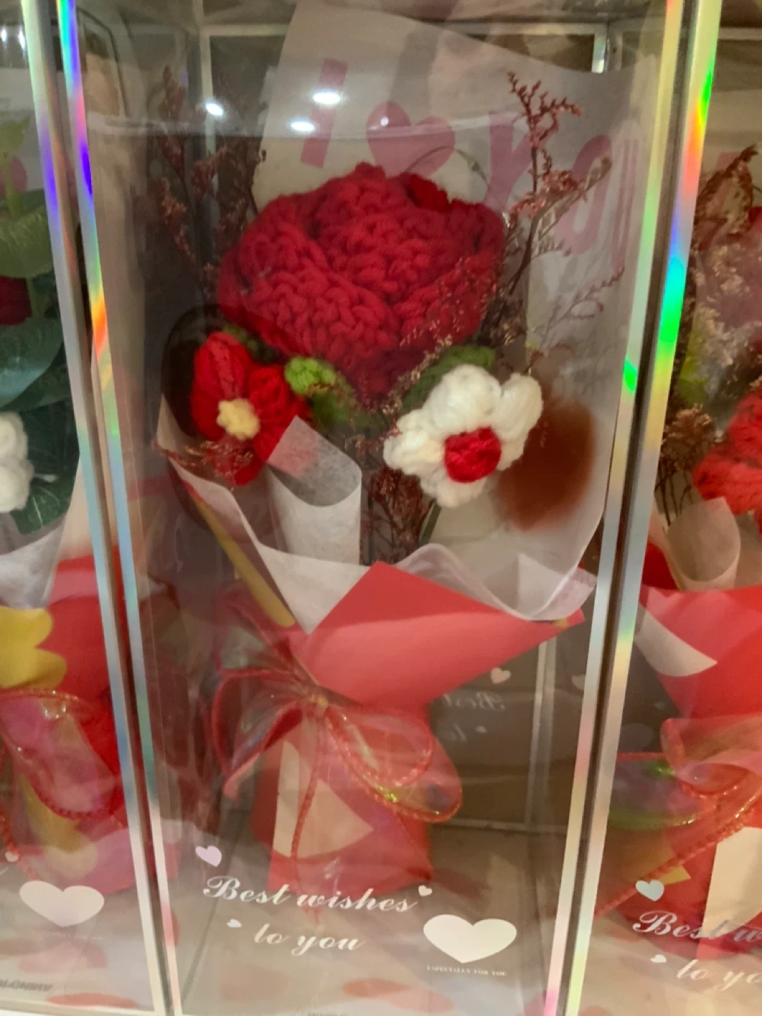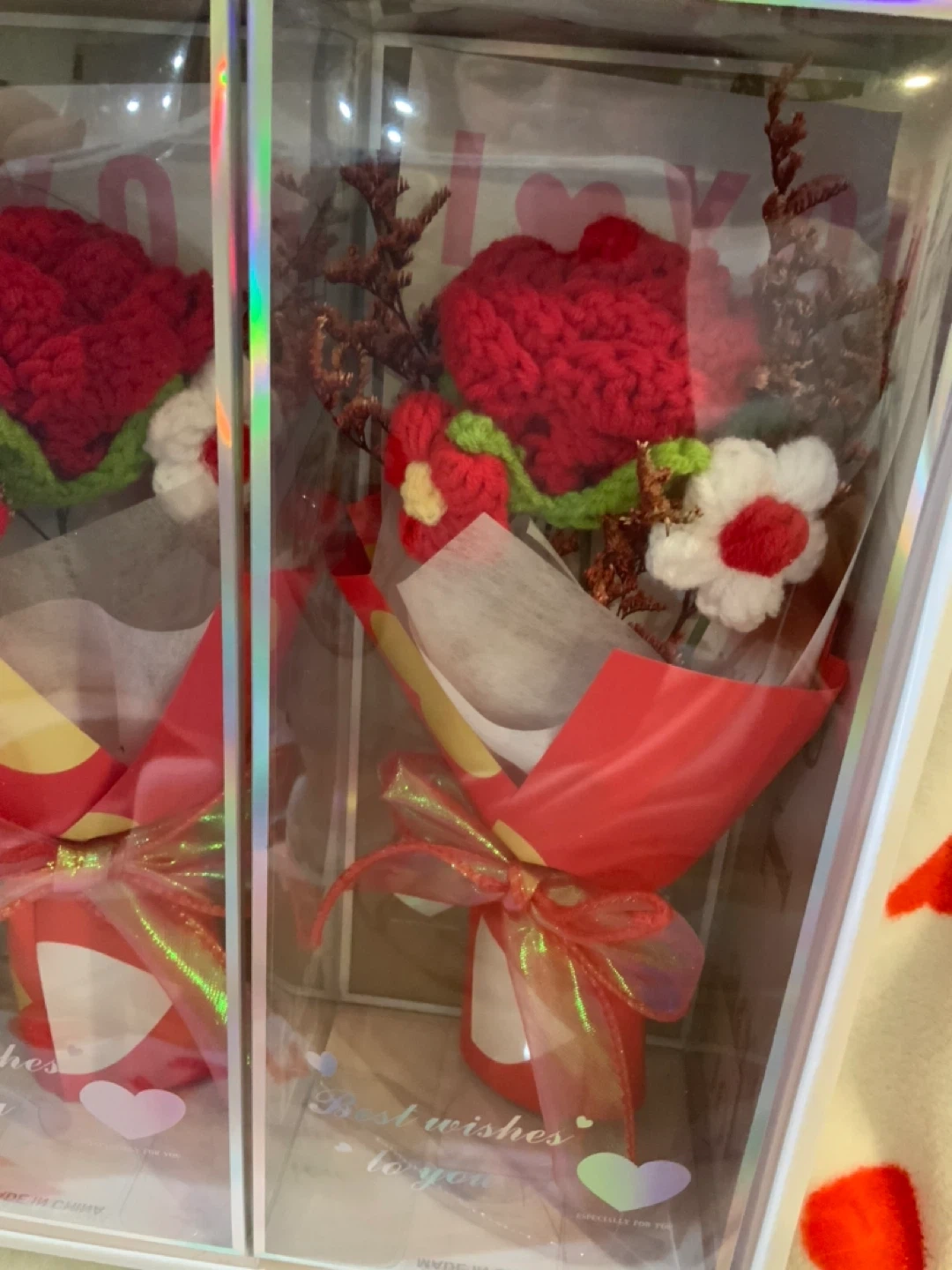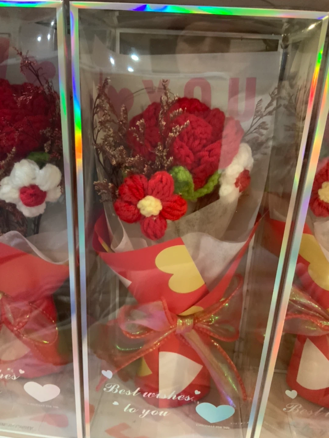 This is a cute crocheted flower bouquet presented in a clear gift box. It features red and white crocheted flowers with green leaves and some dried filler. The bouquet is tied with a red ribbon and bow. It's ready for gifting! $10 each