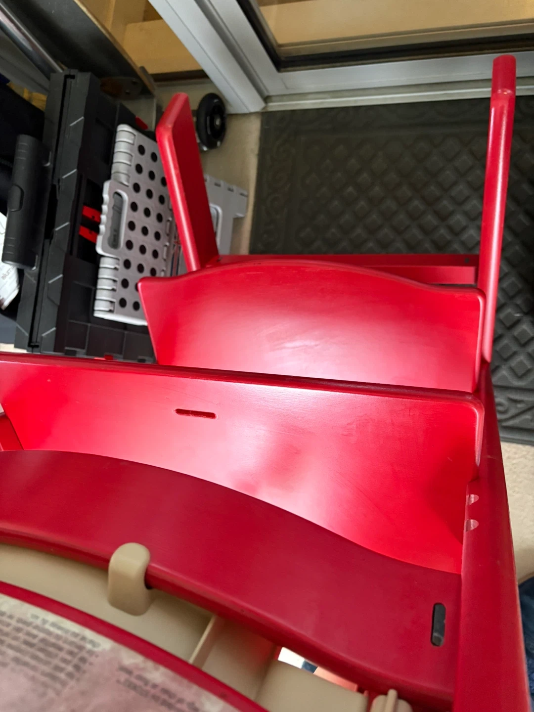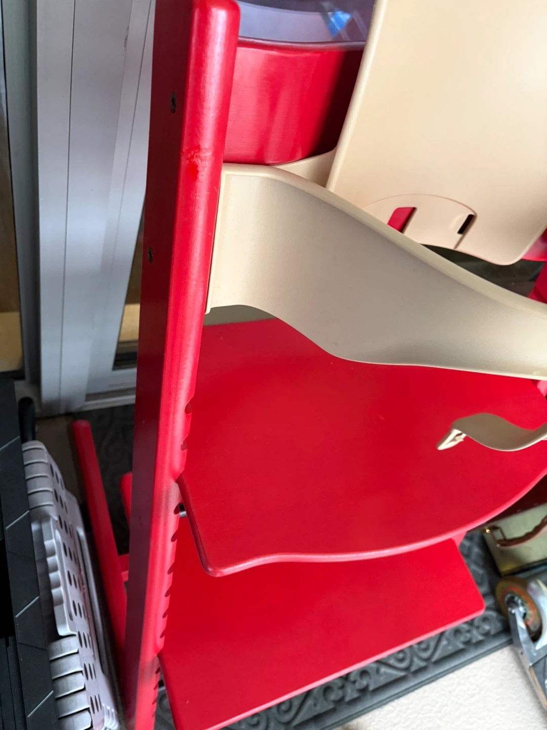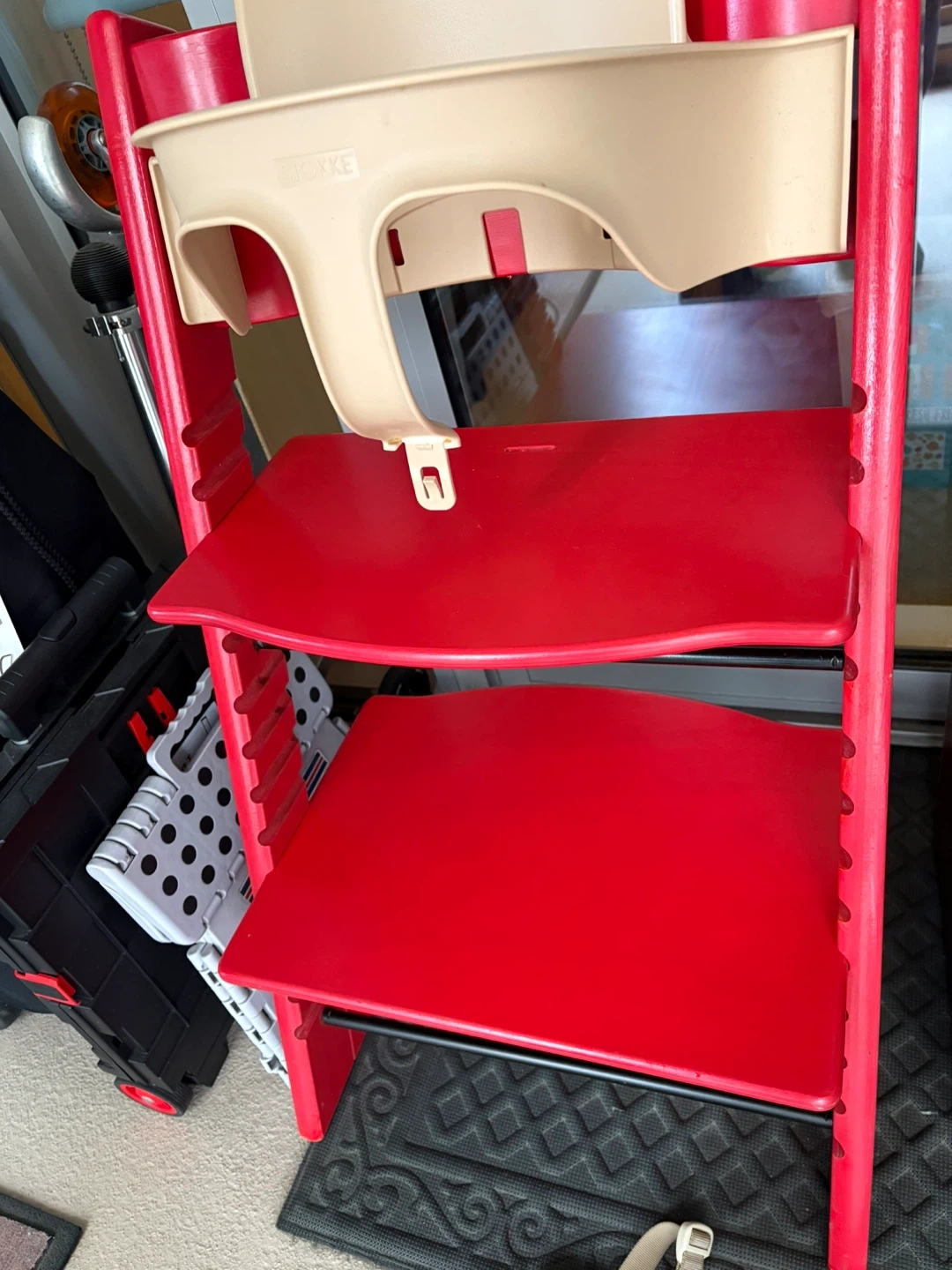 This Stokke Tripp Trapp high chair comes in red with a beige baby set. It includes the harness and cushions. Red wooden frame and seats. Adjusts as your child grows!
