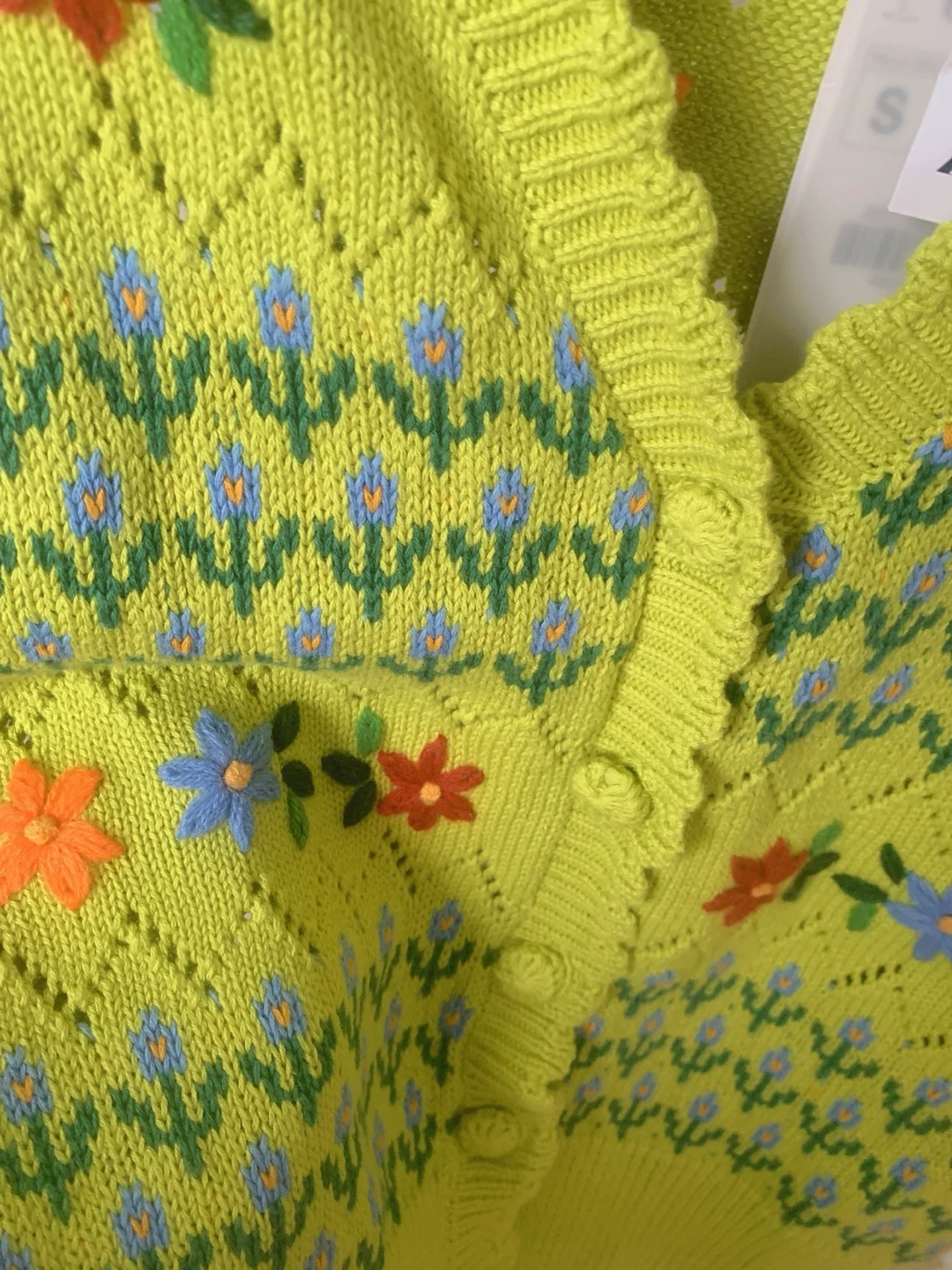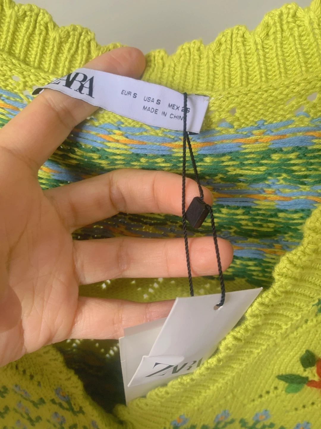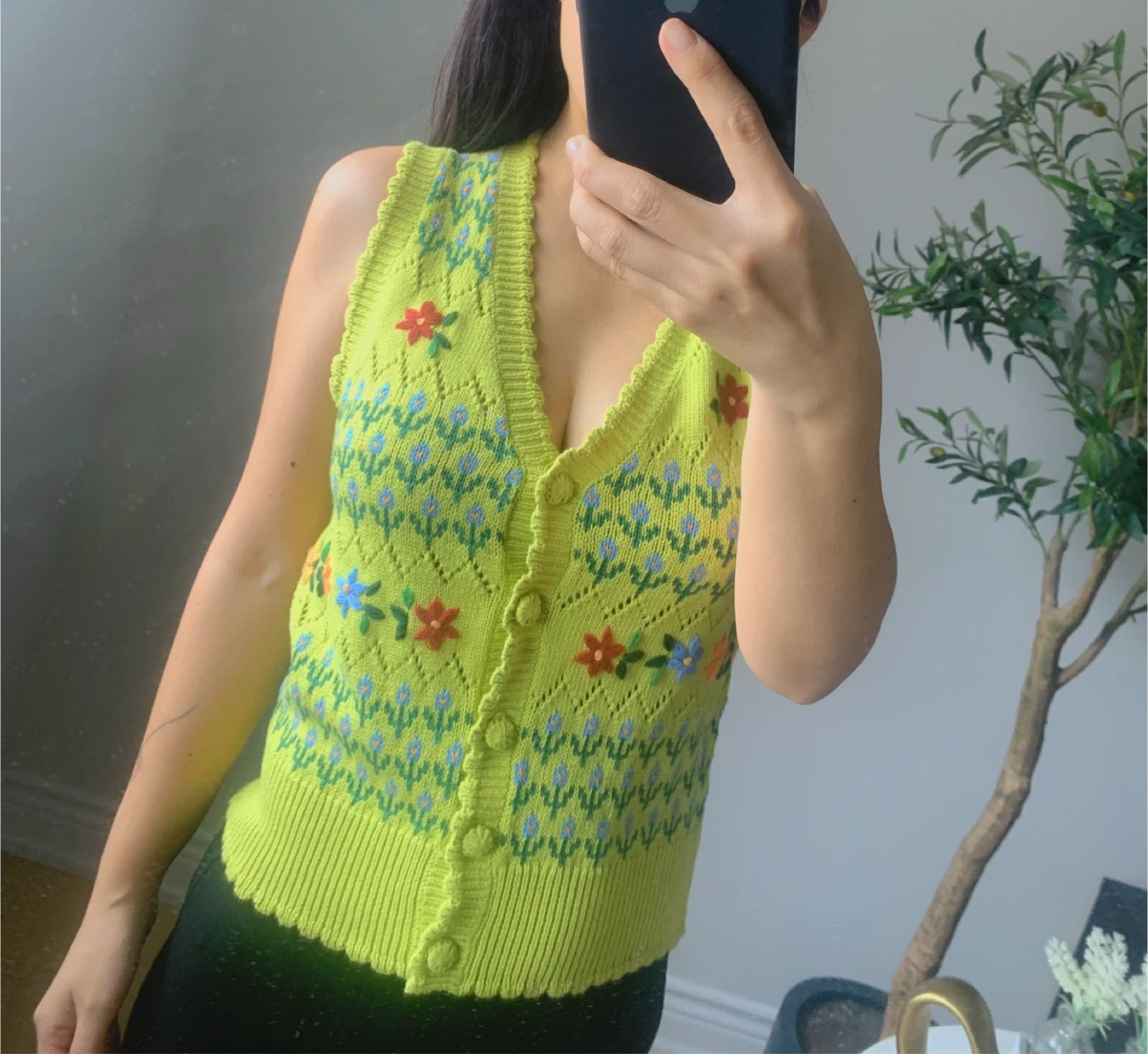ZARA Lime Green Knit Vest Floral Embroidery New