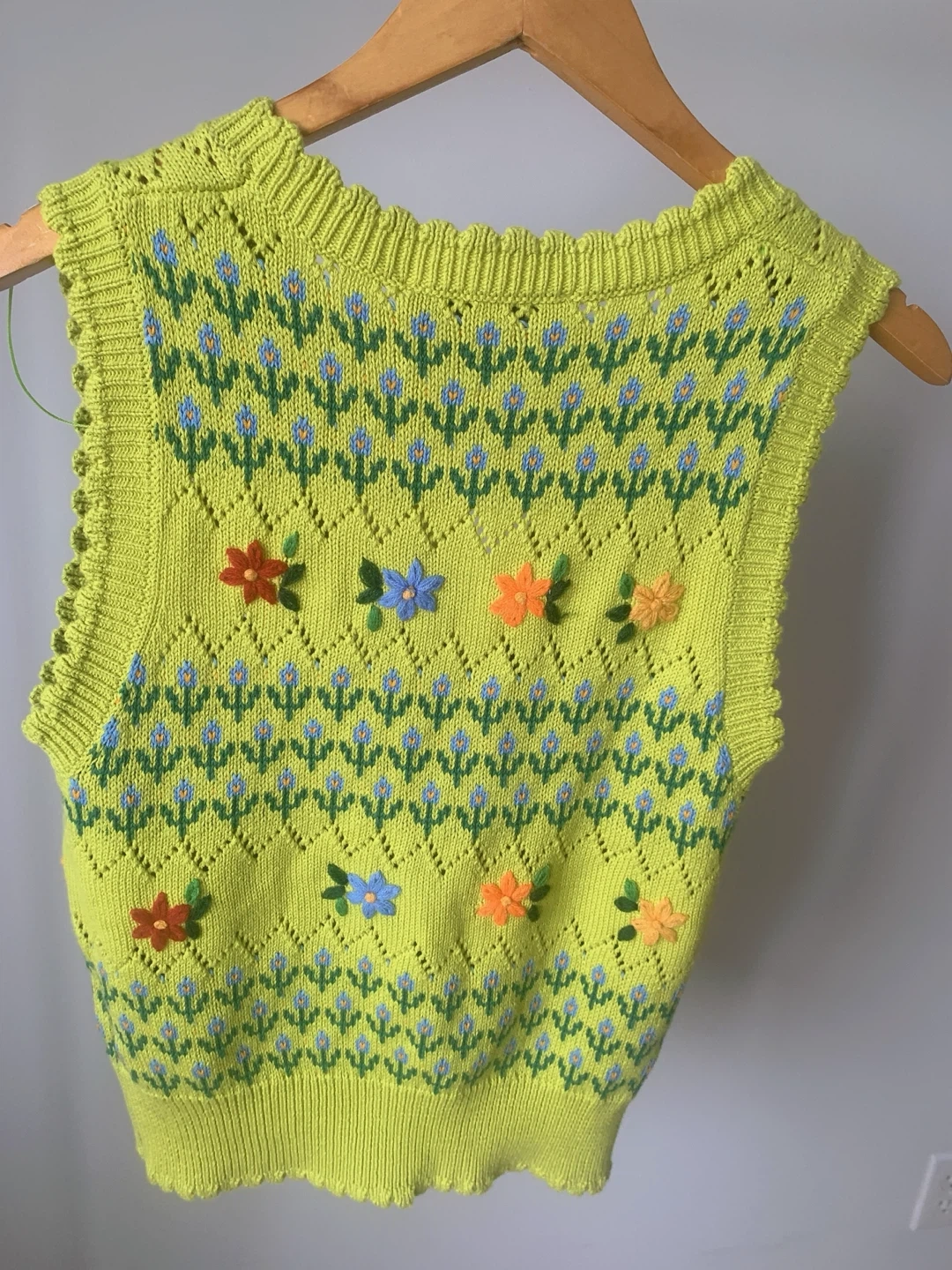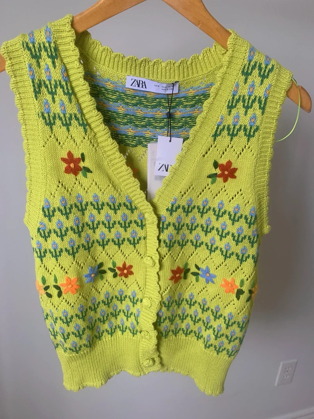 ZARA Lime Green Knit Vest Floral Embroidery New