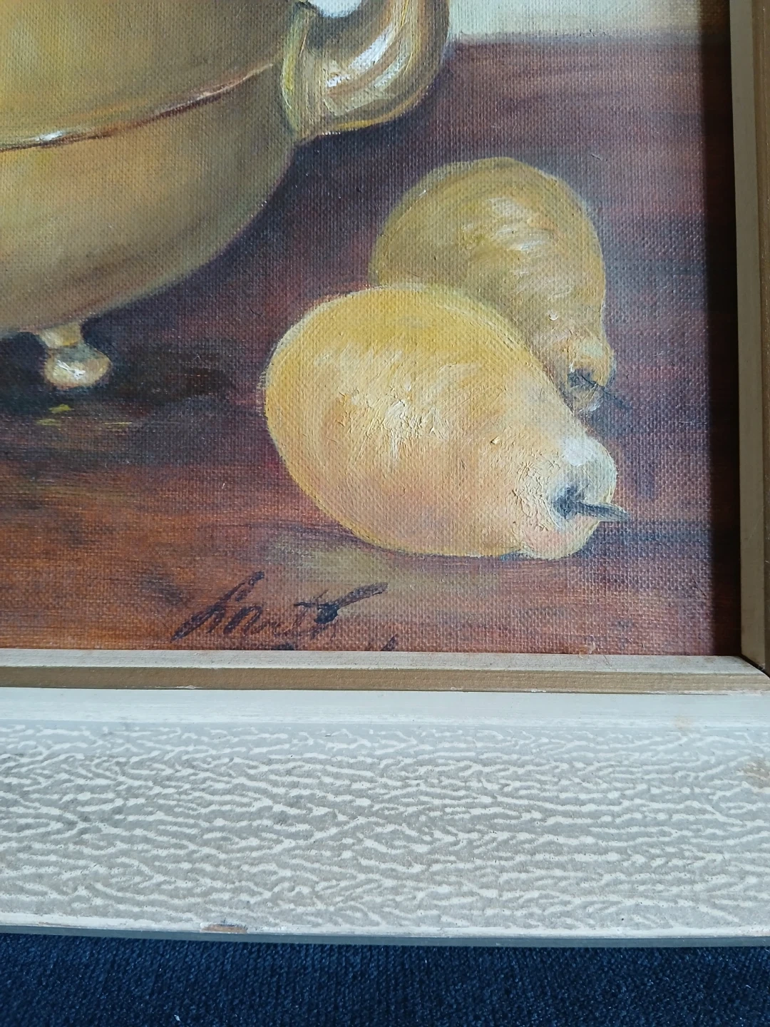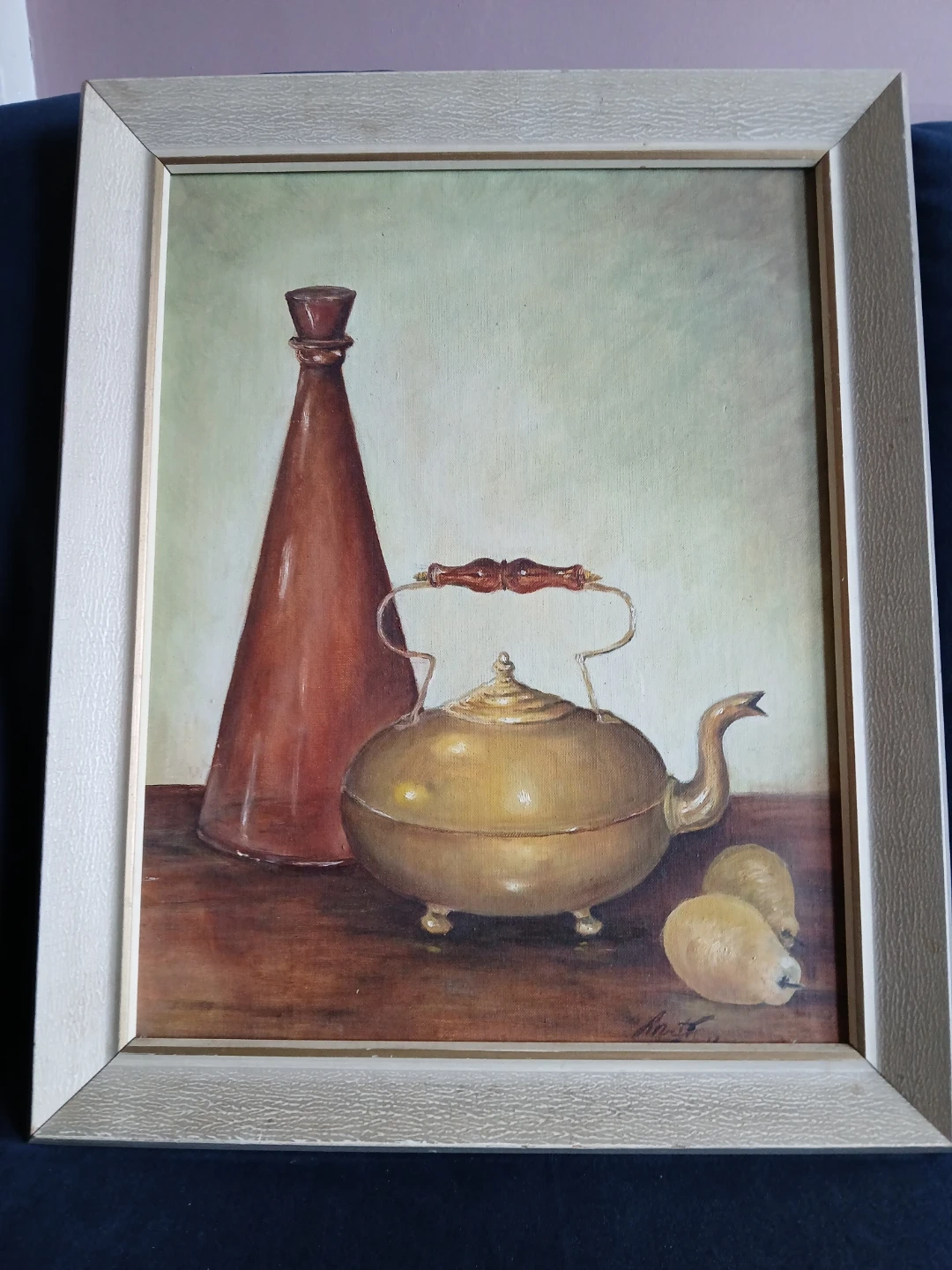 Title: still life with brass kettle, bottle and pears. This is a framed still life Oil painting on canvas is an "Academy" panel, size 14"x18". It's a lovely piece that would add a touch of warmth to any room. Artist: "Anit" ( lower right) likely a regional hobbyist. Age: Circa 1960s-1970s the back features Vintage M. Grumbacher lnc. Canvas panel # 433.