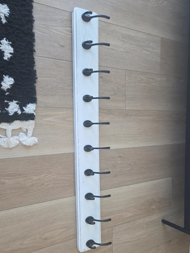 Here's a lovely coat rack to keep your entryway organized! It's a white wooden board with several black hooks, perfect for hanging coats, hats, or even dog leashes. It's in great condition and ready to find a new home