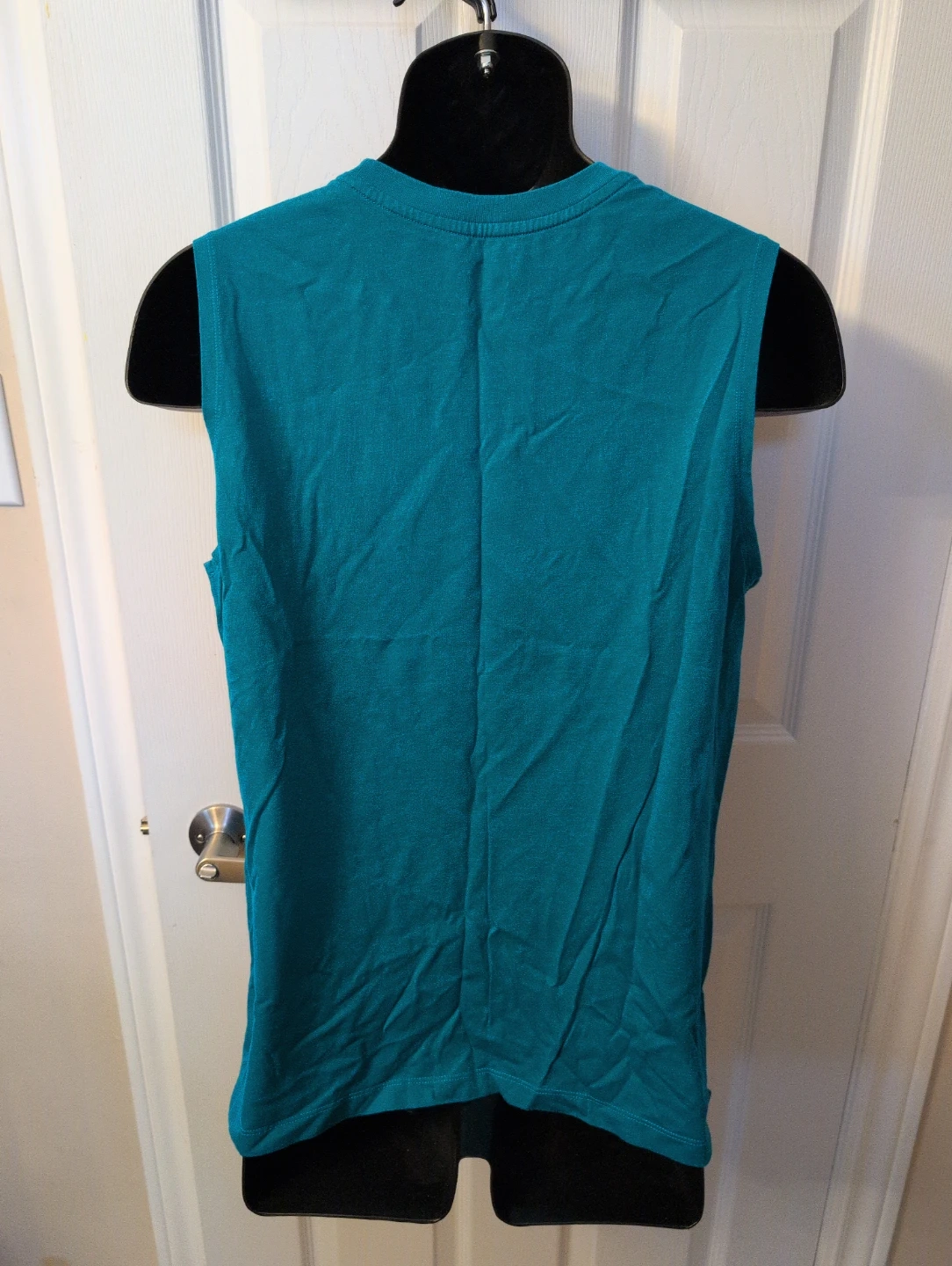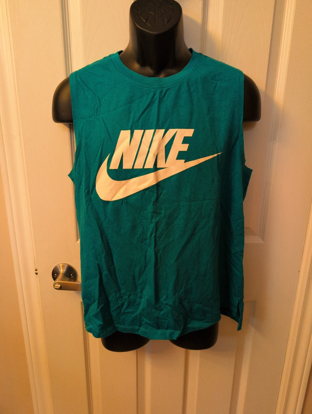 This is a teal Nike sleeveless tank top for men in size medium. It's made from a blend of 44% Modal, 42% Cotton, and 14% Nylon. Great for workouts or casual wear!