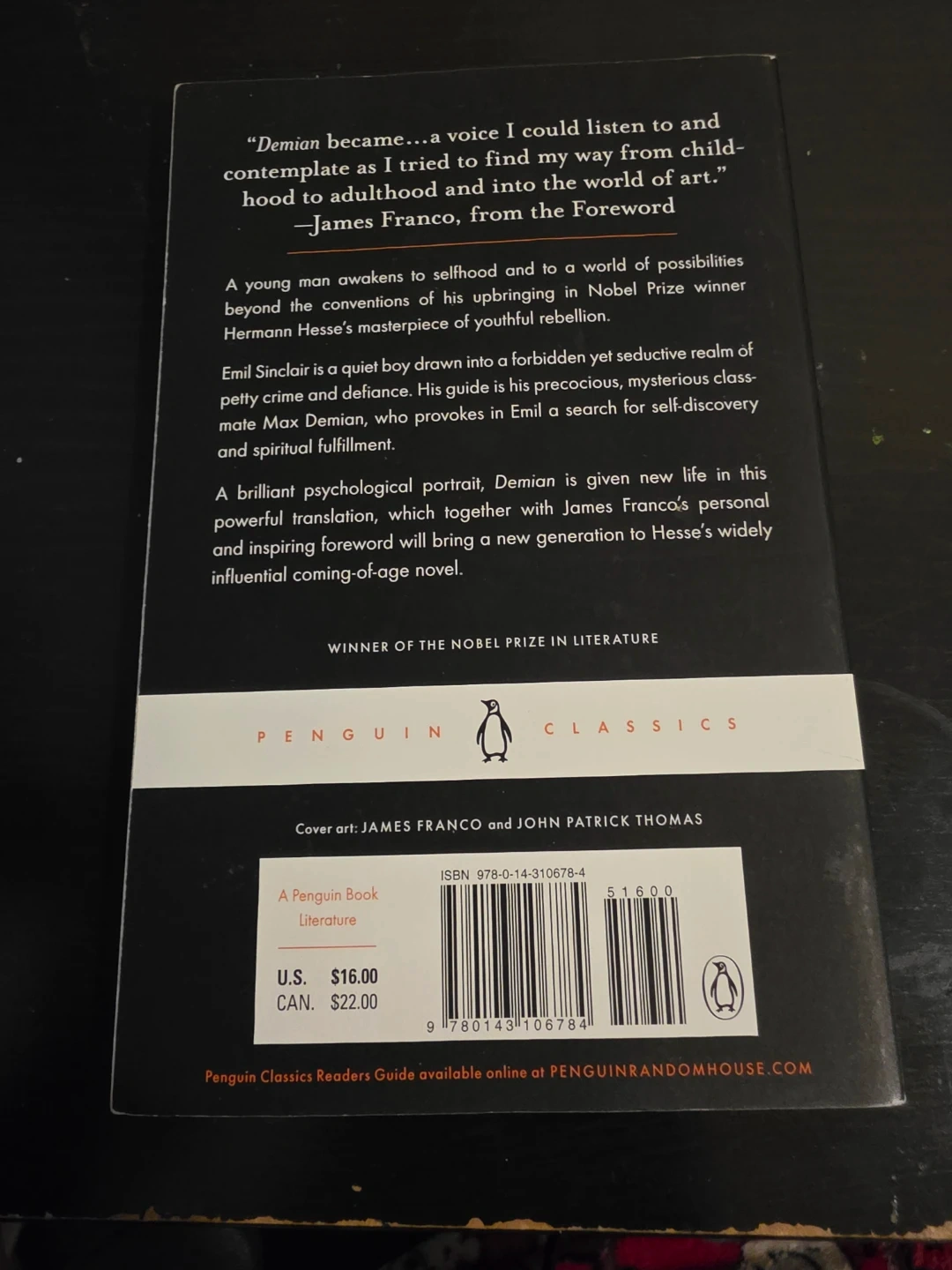Selling a copy of Demian by Hermann Hesse, published by Penguin Classics. It's a new translation with a foreword by James Franco and an introduction by Ralph Freedman. The cover art is by James Franco and John Patrick Thomas. The price on the back cover is $22.00 CAN