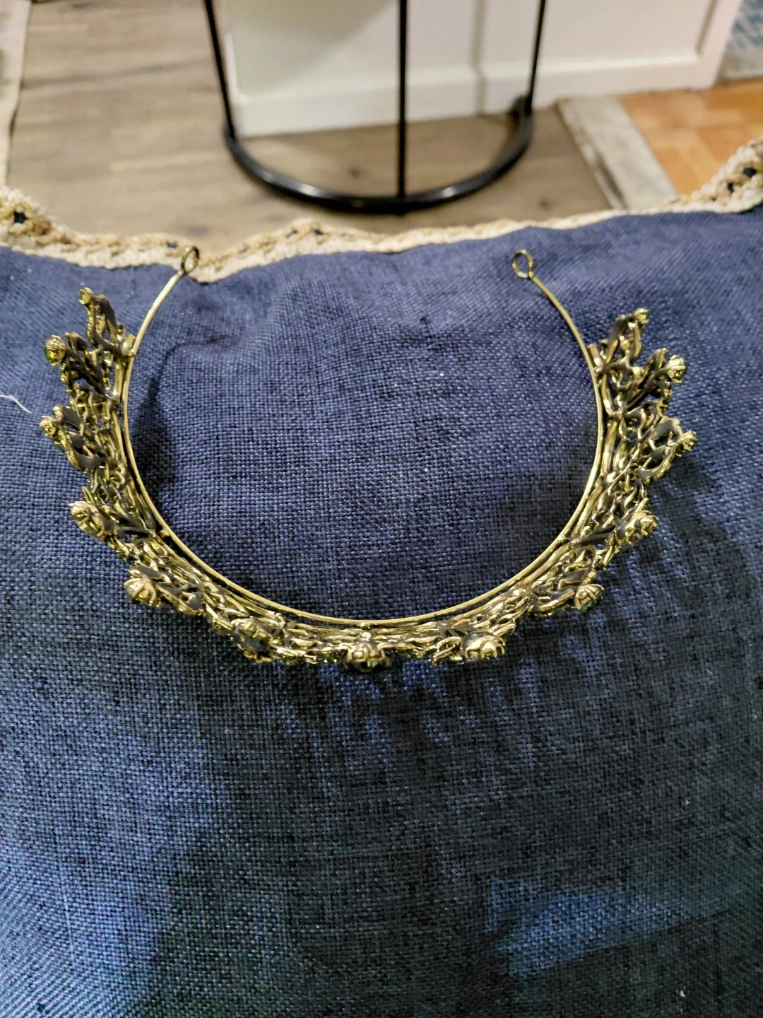This vintage-style tiara features intricate metalwork with sparkling rhinestones and faux gems. It's designed to sit comfortably on the head. This piece is perfect for adding a touch of regal elegance to any special occasion or costume.