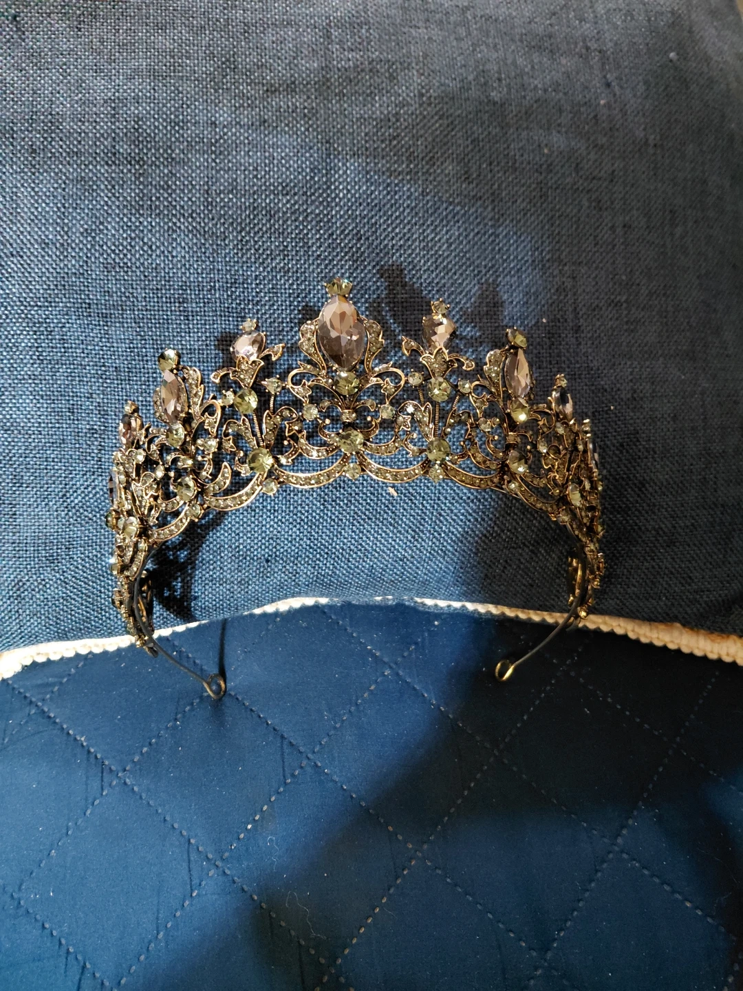 This vintage-style tiara features intricate metalwork with sparkling rhinestones and faux gems. It's designed to sit comfortably on the head. This piece is perfect for adding a touch of regal elegance to any special occasion or costume.
