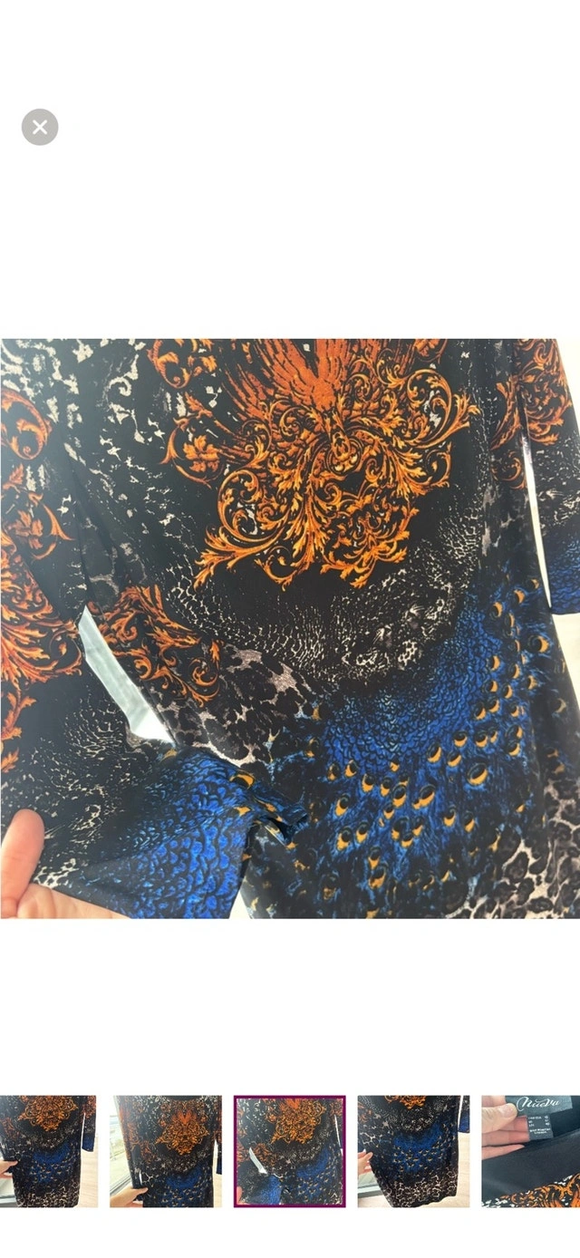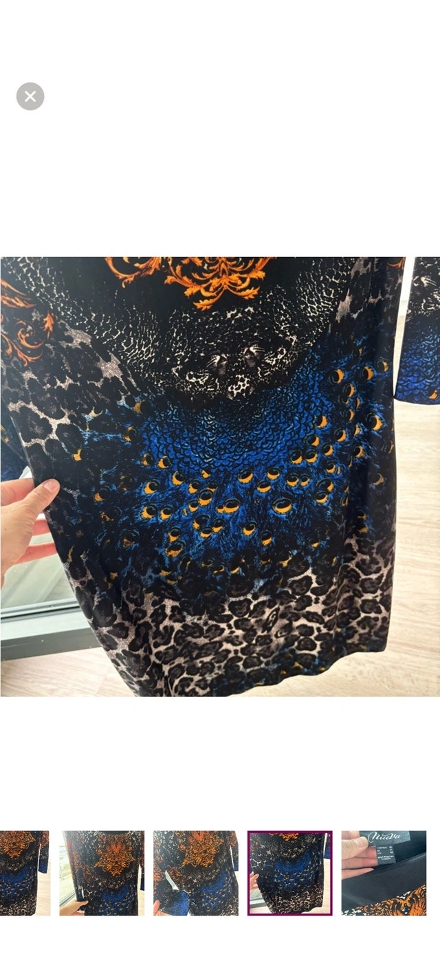 Add some flair to your wardrobe with this striking Nuevai dress, showcasing a vibrant orange and blue pattern. This eye-catching piece is in used good condition, ready for its next fashionable adventure. Size: Large (12-14) Brand: Nuevai. If you're seeing this ad, it's still available!