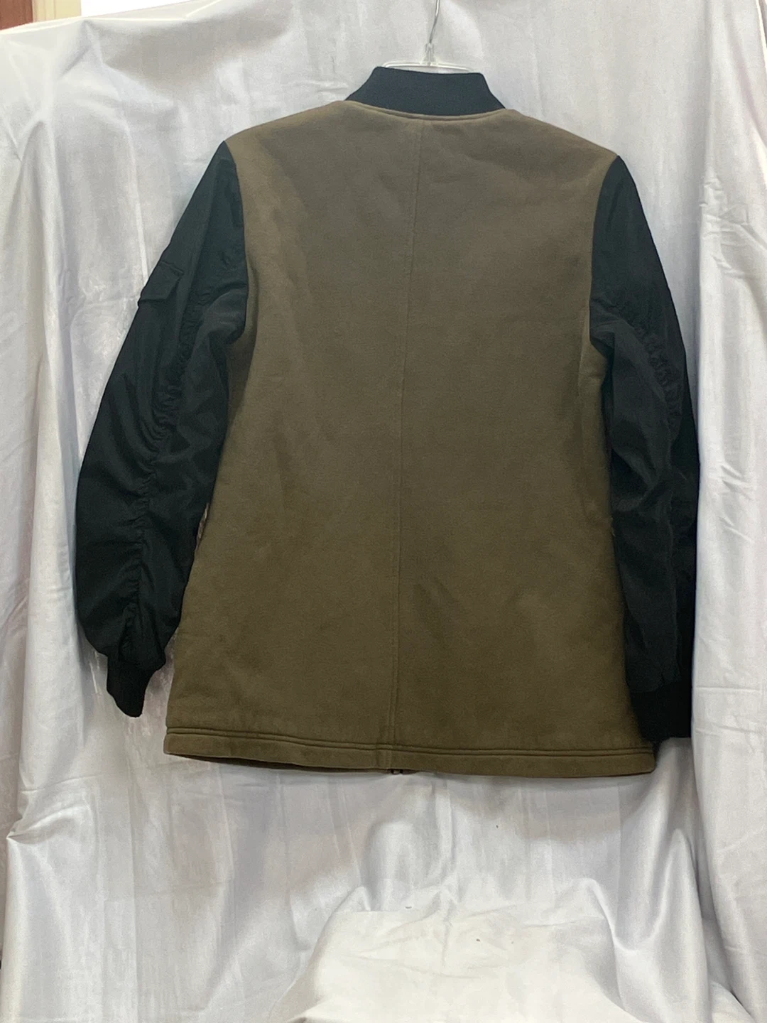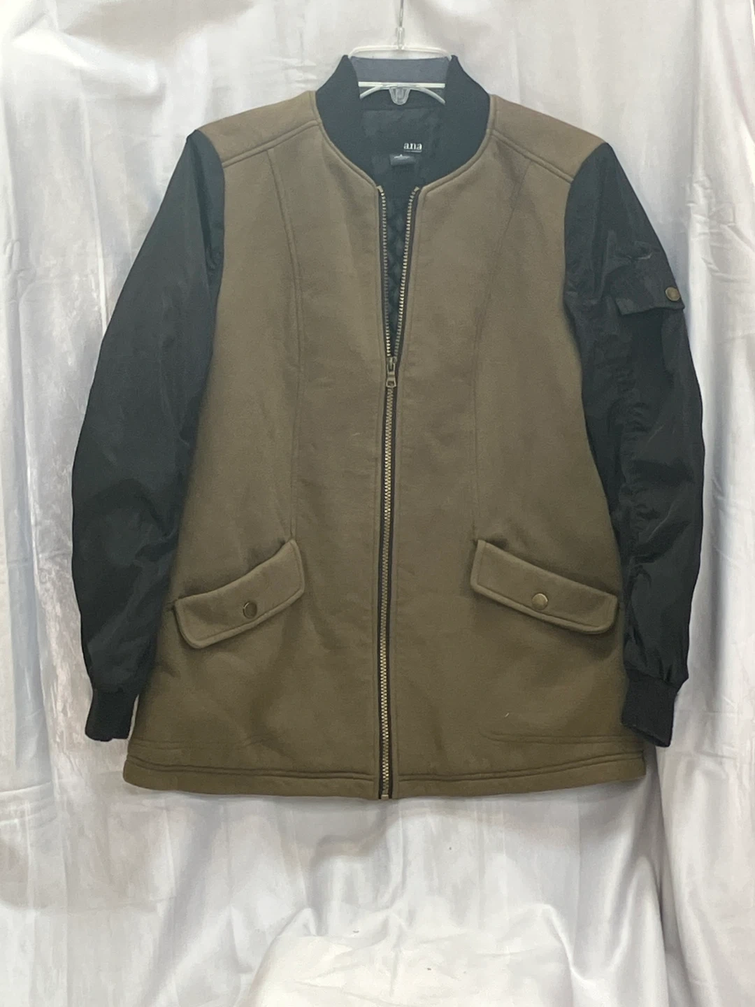 Ana bomber jacket with olive green body and black sleeves. Two button flap pockets on the front. Zipper closure. Ribbed cuffs and hem.