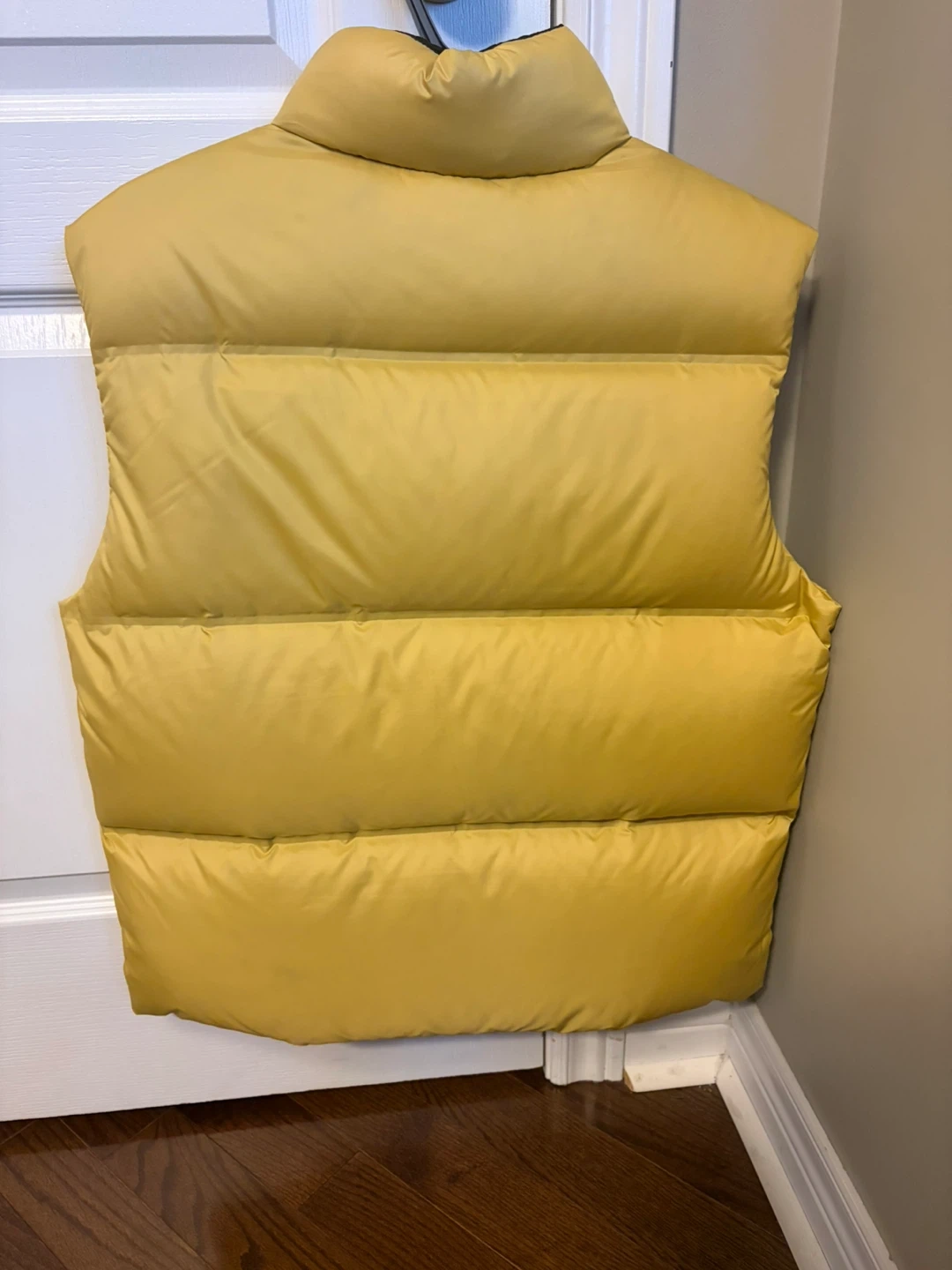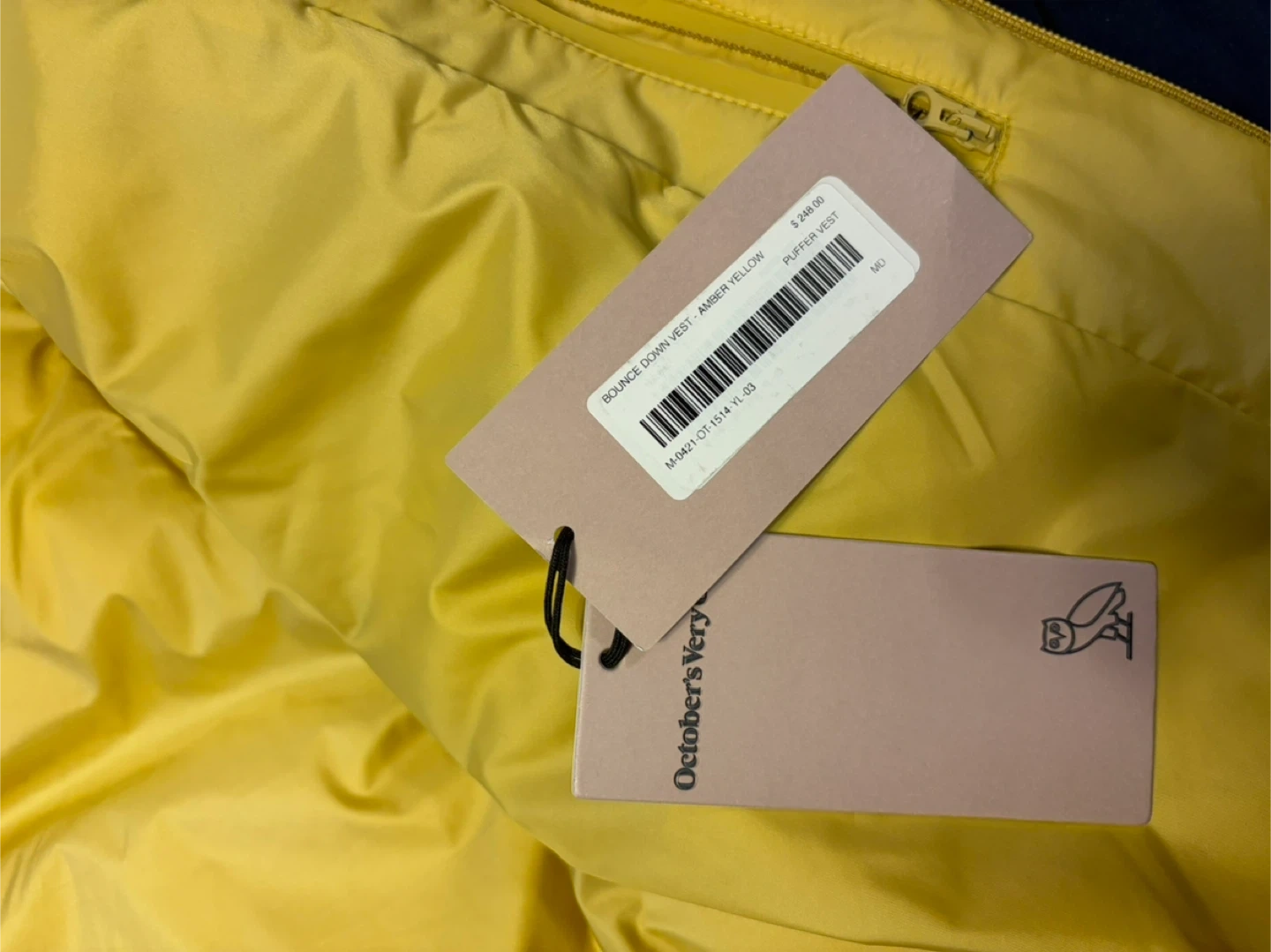 This is an October's Very Own Bounce Down Puffer Vest in Amber Yellow. It's a sleeveless puffer vest with a zip closure. Puffer vest style. Brand new
