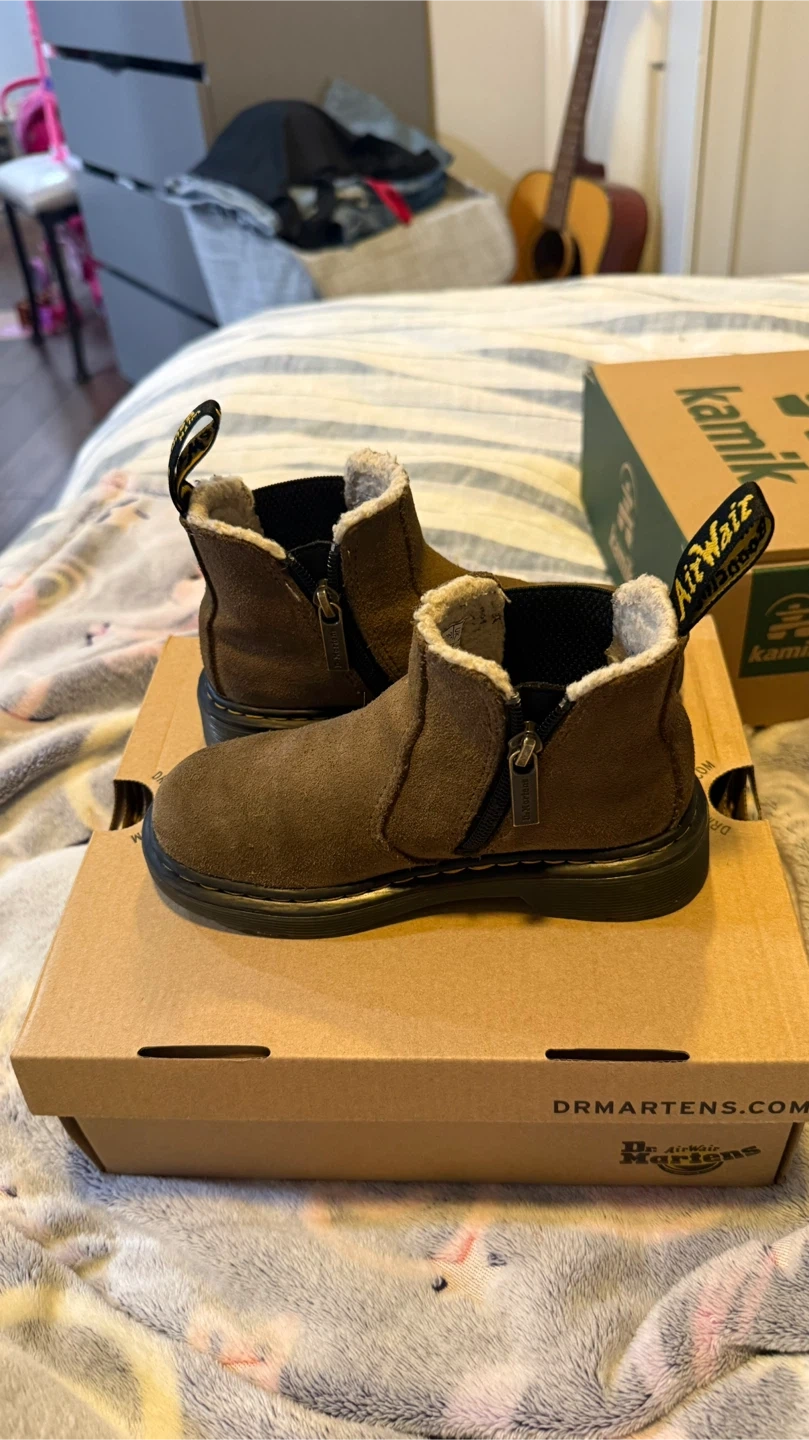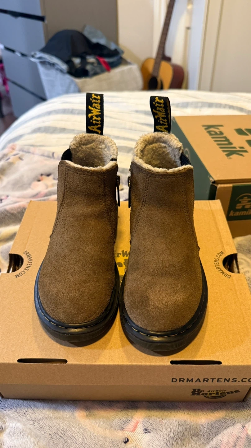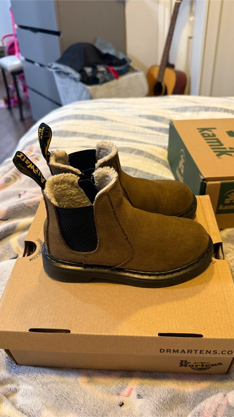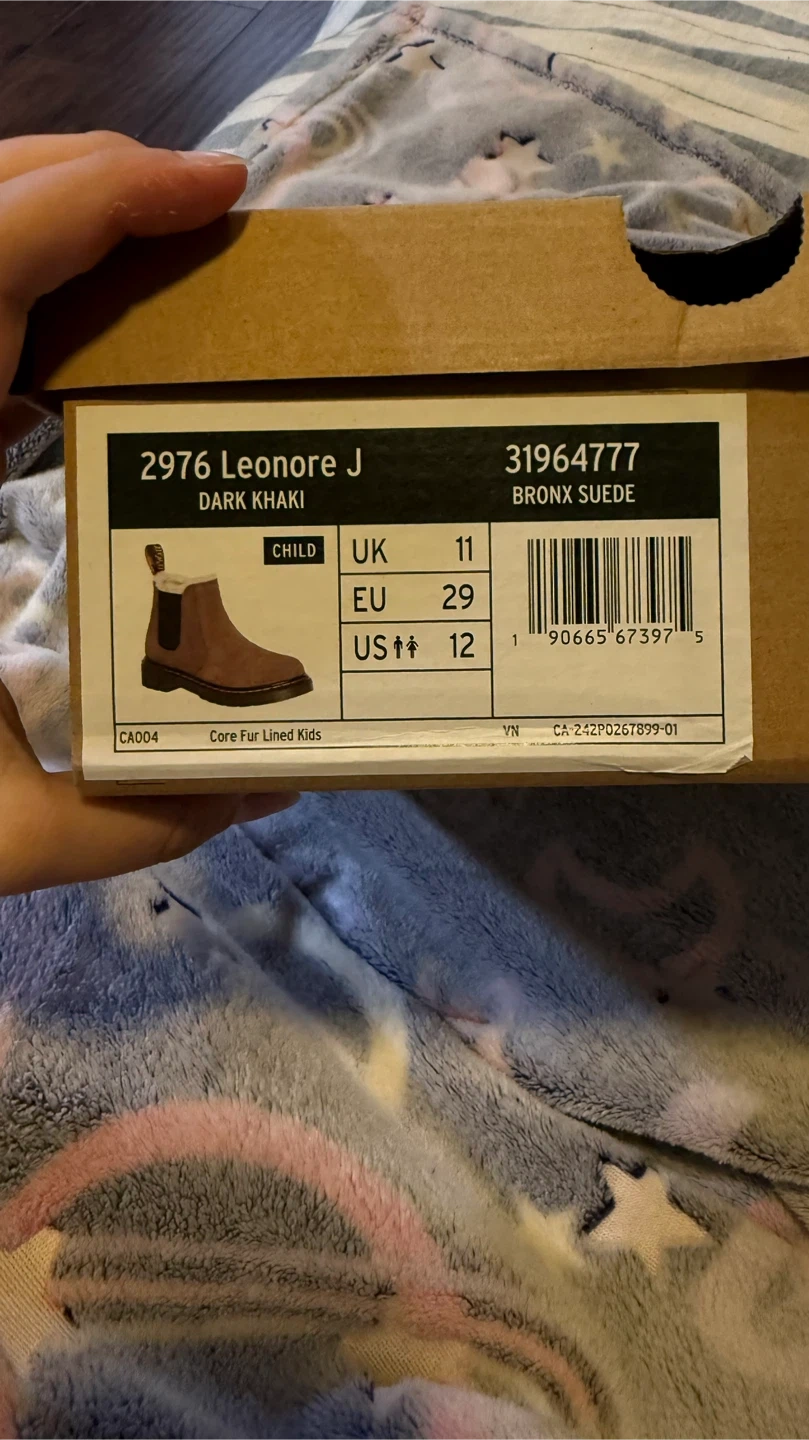 Dr. Martens 2976 Leonore J Chelsea boots in Dark Khaki suede. Core fur lined for warmth. Children's size UK 11 (EU 29, US 12). Includes original box.