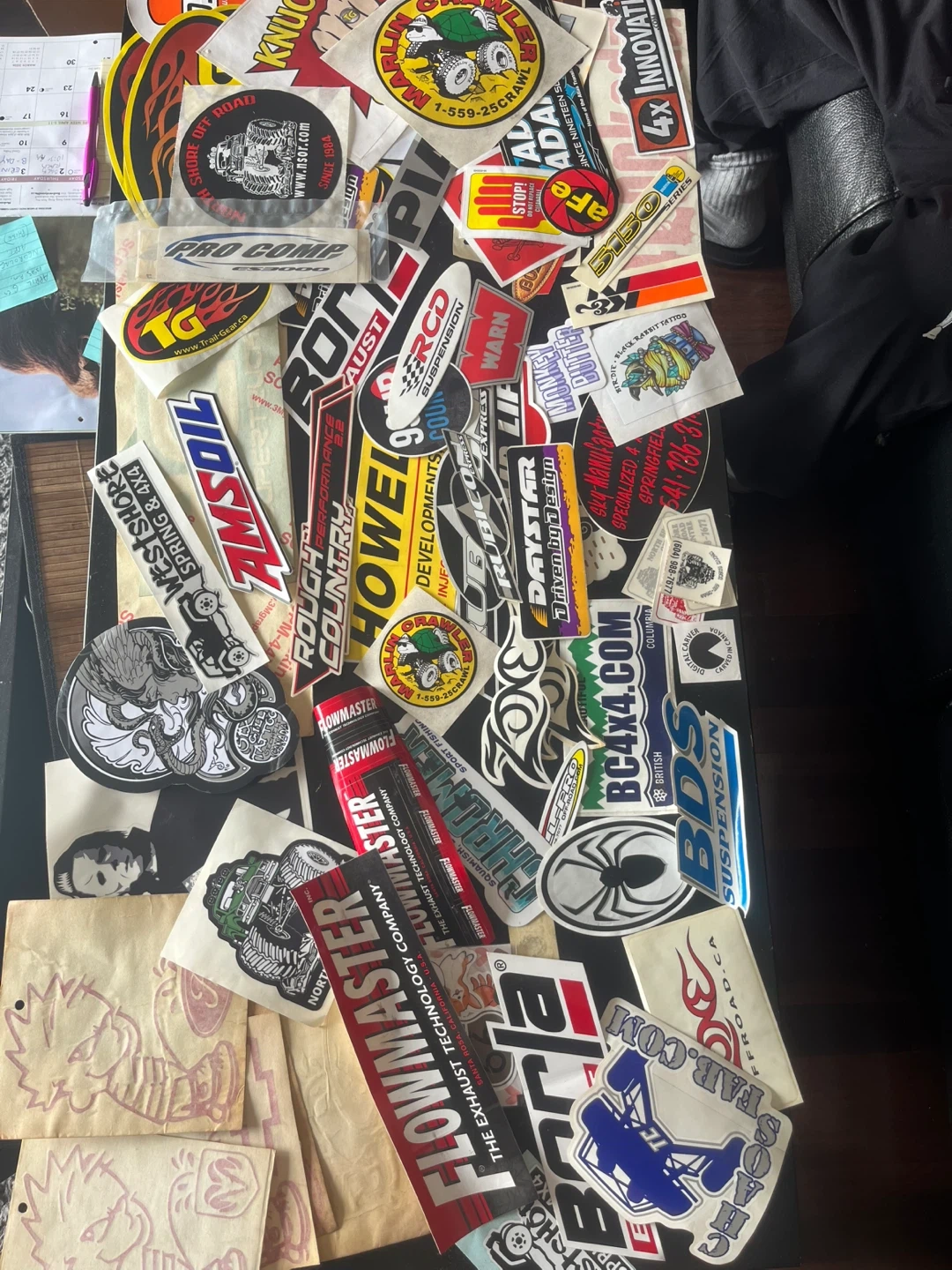 A collection of various off-road and automotive stickers, including brands like Flowmaster, AmsOil, and Pro Comp. These are decals for vehicles and equipment.