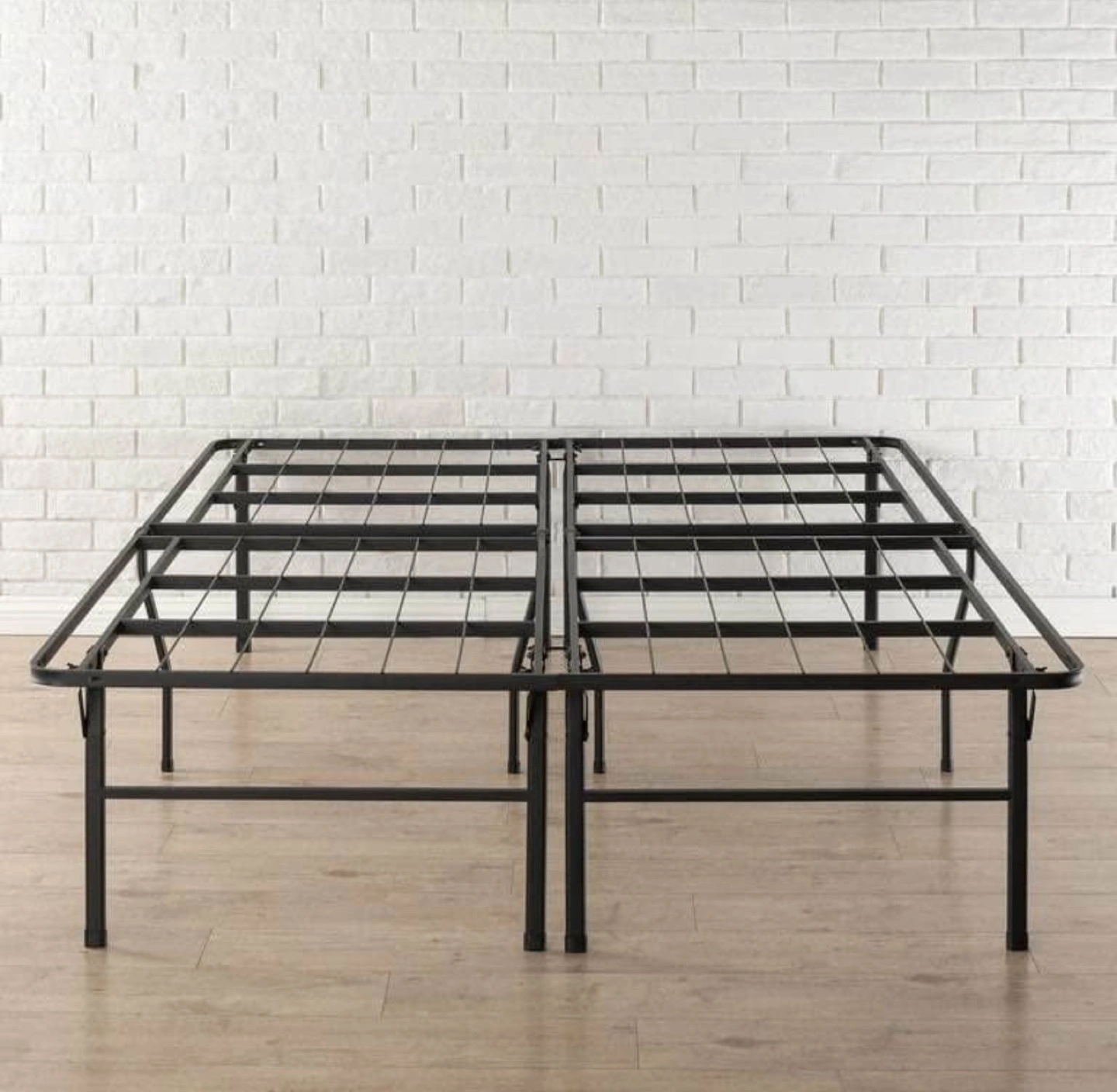 18” high King size metal platform foldable frame. No need of box spring with this bed. Just unfold and use. Heavy duty design with cross welded slats.