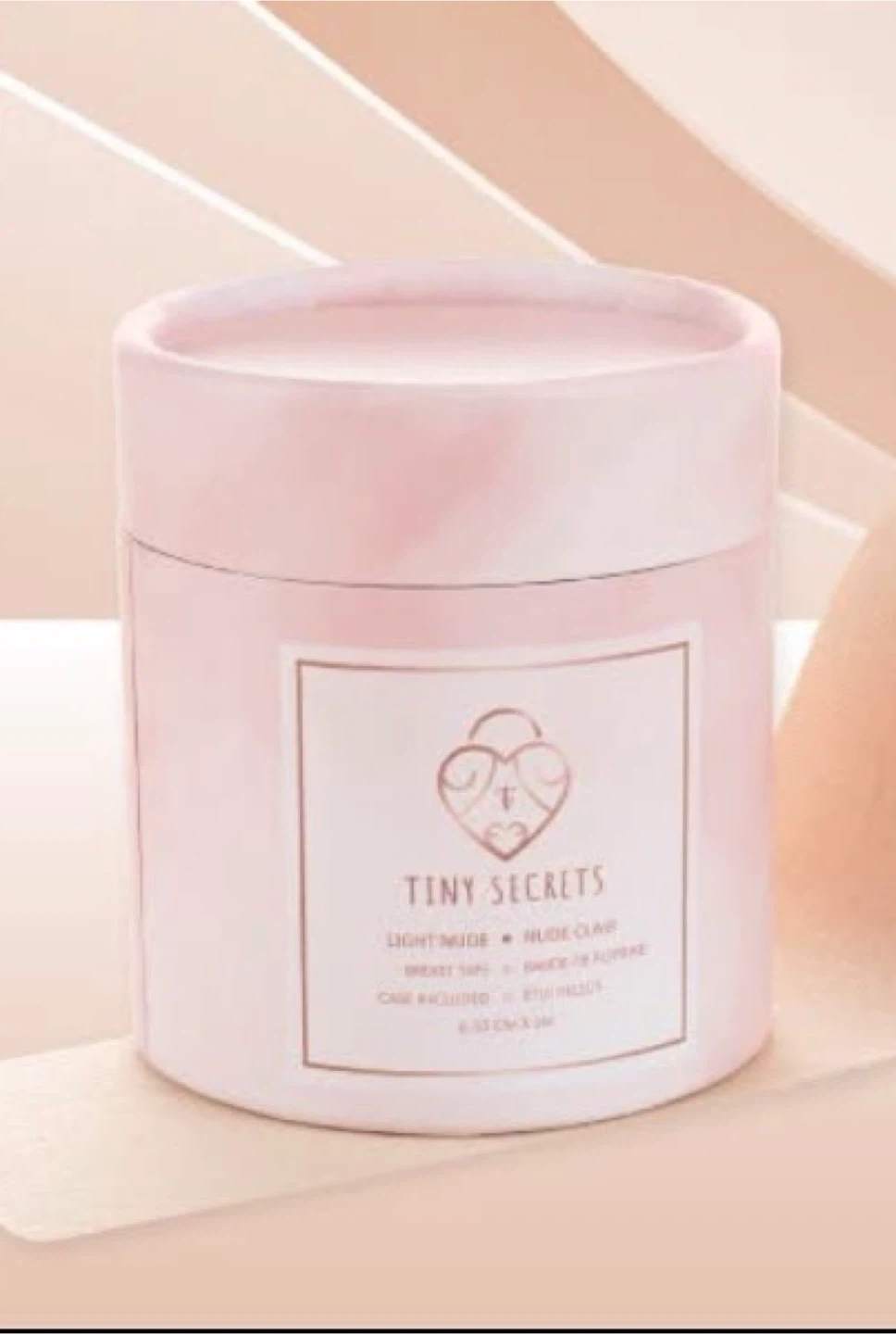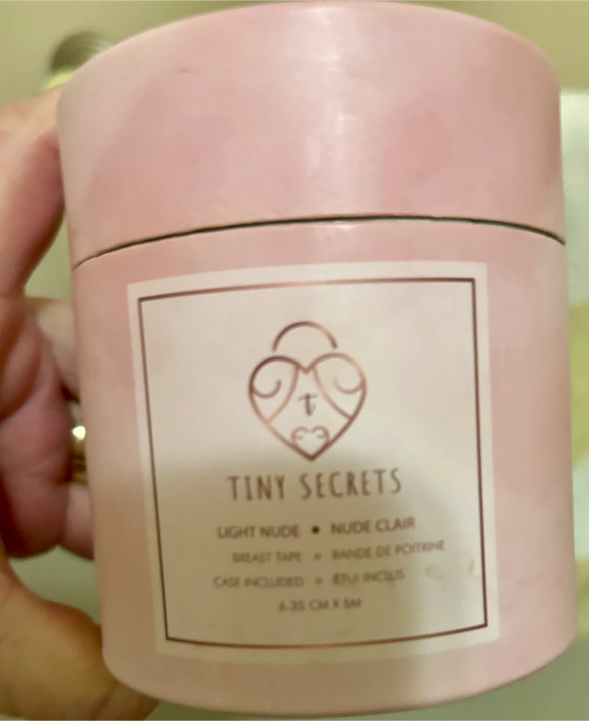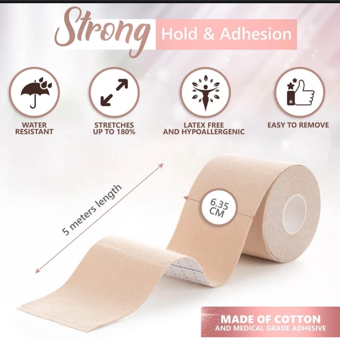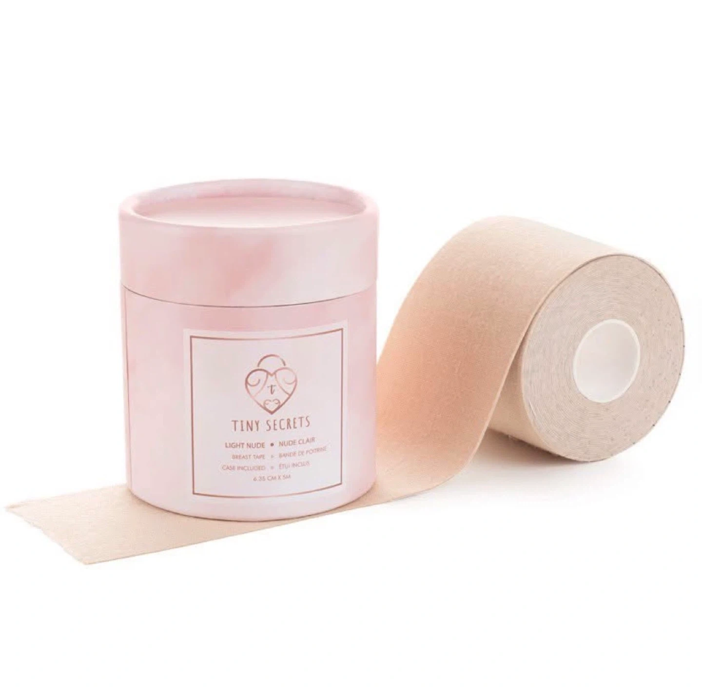 This Tiny Secrets breast tape is made of cotton and medical-grade adhesive. It's water-resistant, stretches up to 180%, and is latex-free and hypoallergenic. It's also easy to remove. This tape can be used in a variety of ways for support and shaping.