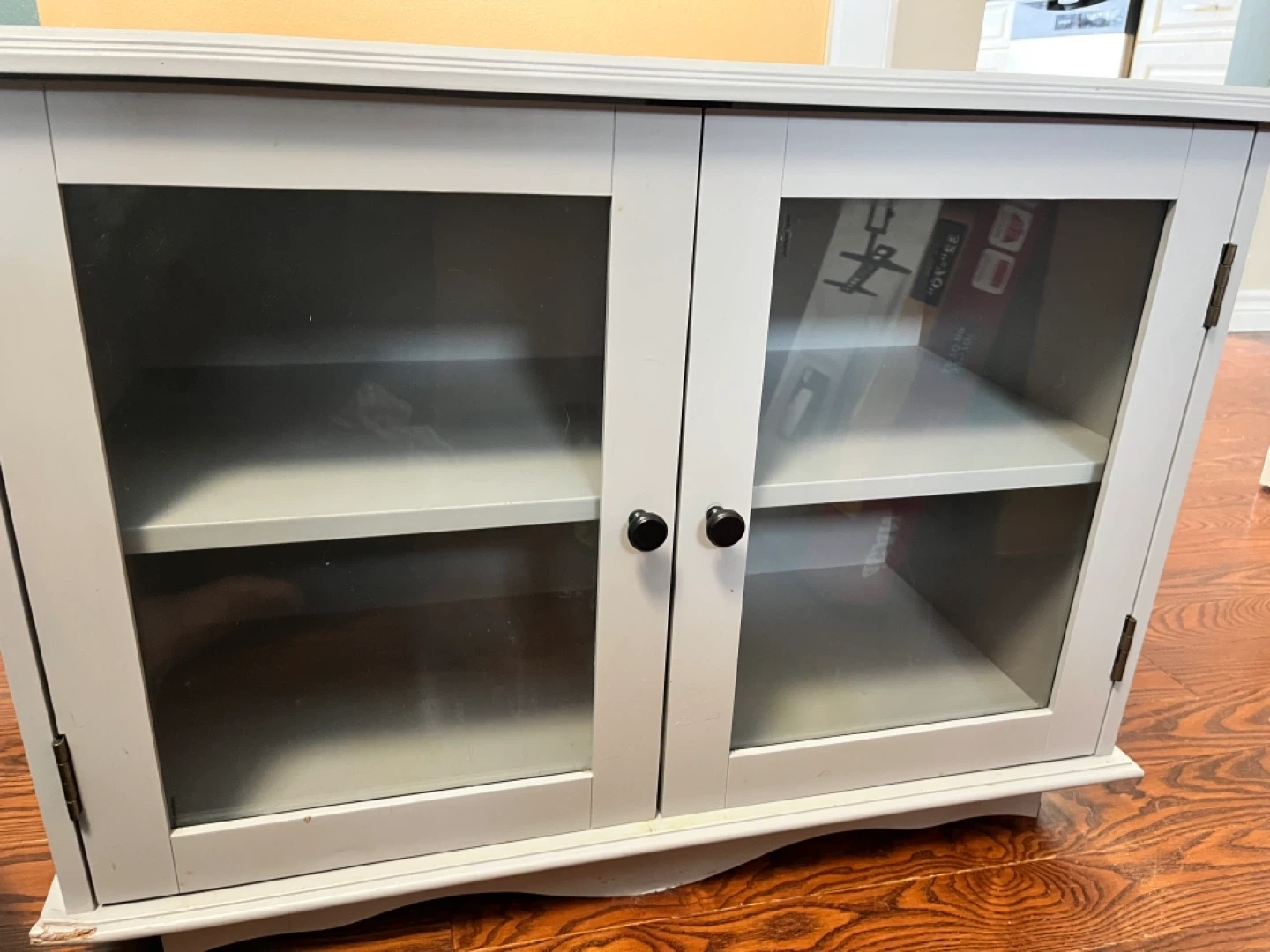 This grey cabinet was designed for Pier 1 Imports. It features two glass doors with two interior shelves. The unit measures approximately 29 inches tall and 48 inches wide.