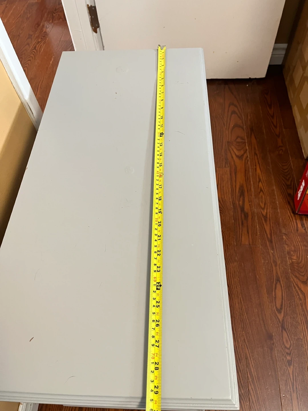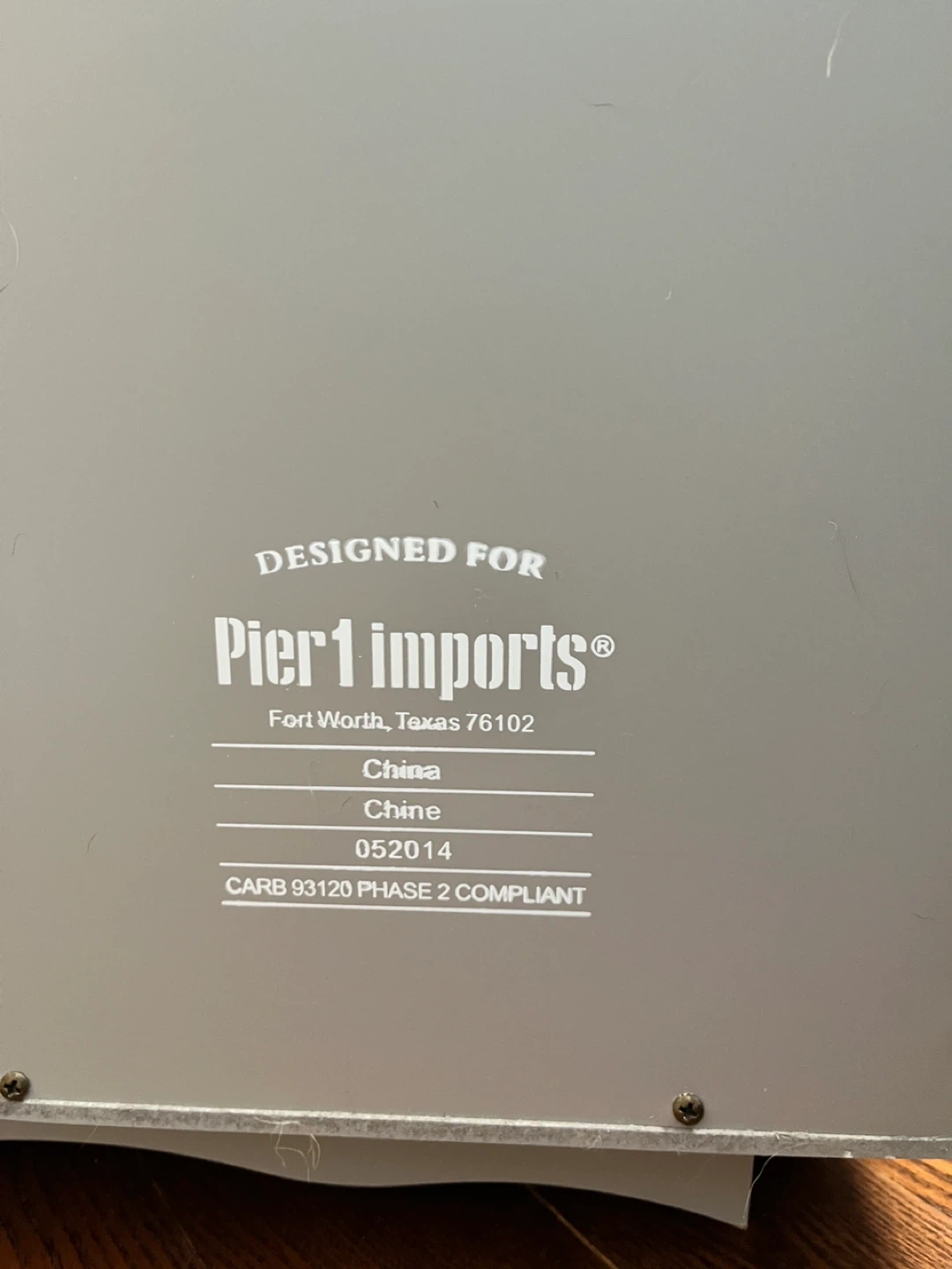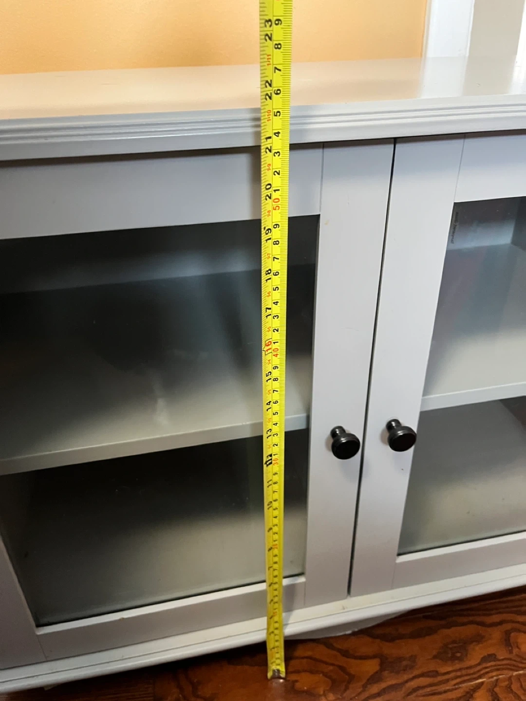 This grey cabinet was designed for Pier 1 Imports. It features two glass doors with two interior shelves. The unit measures approximately 29 inches tall and 48 inches wide.