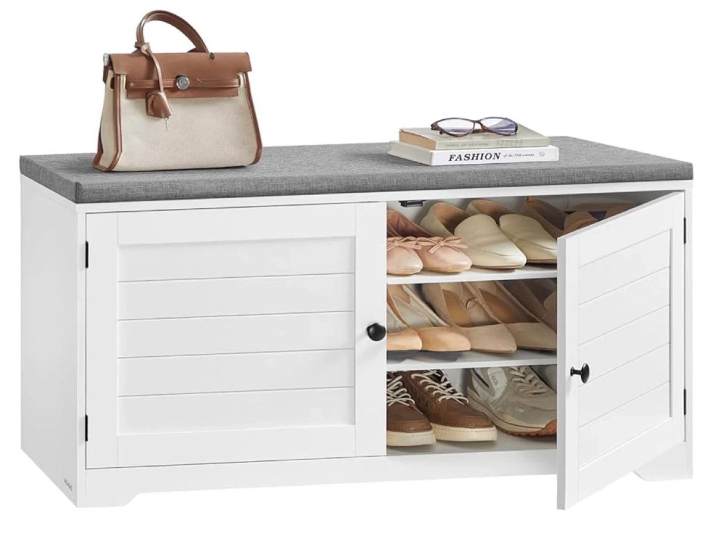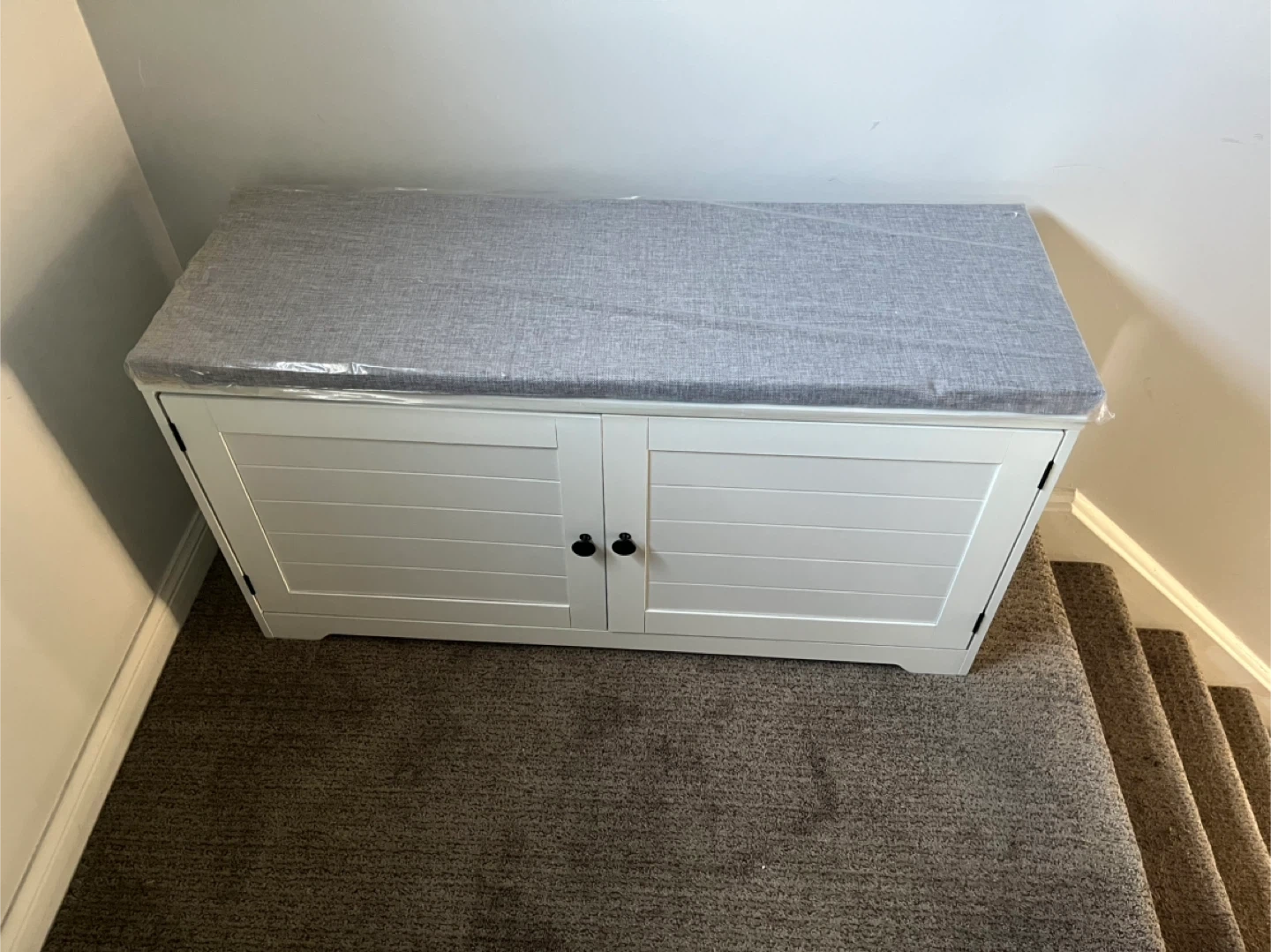 This white storage cabinet has two doors and a comfortable padded seat top. It's 39.8 inches wide and 20.7 inches tall. The top supports up to 300 lb (136 kg).