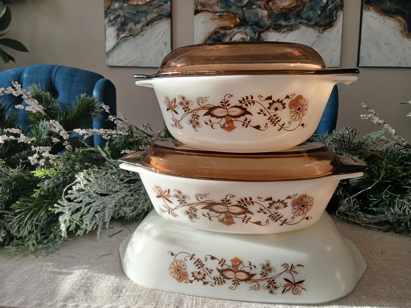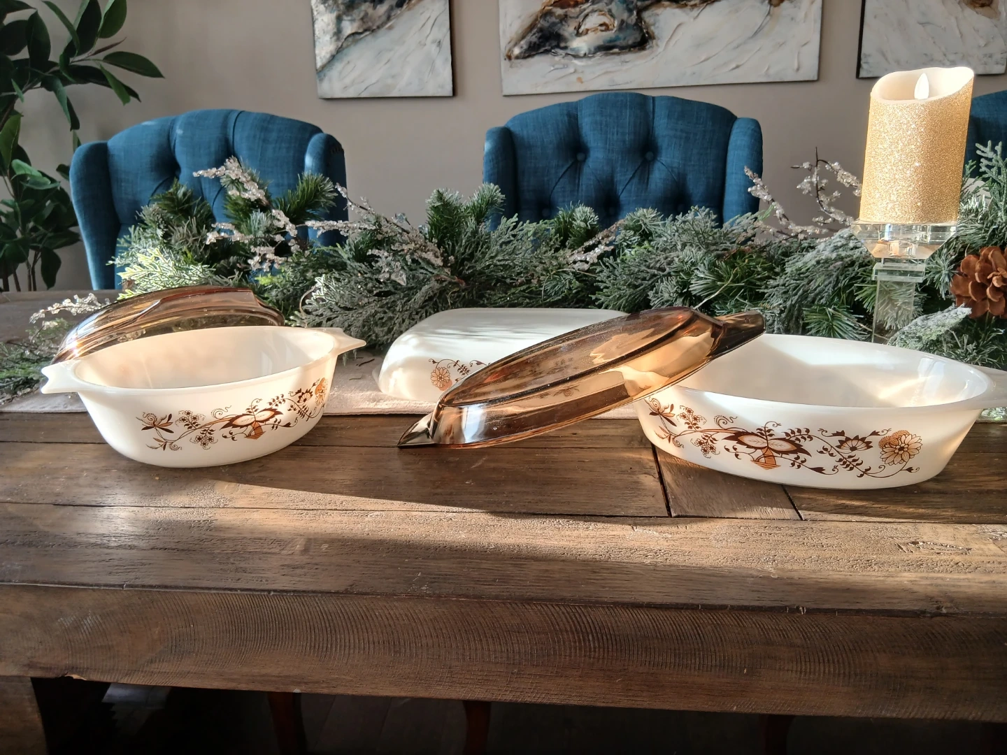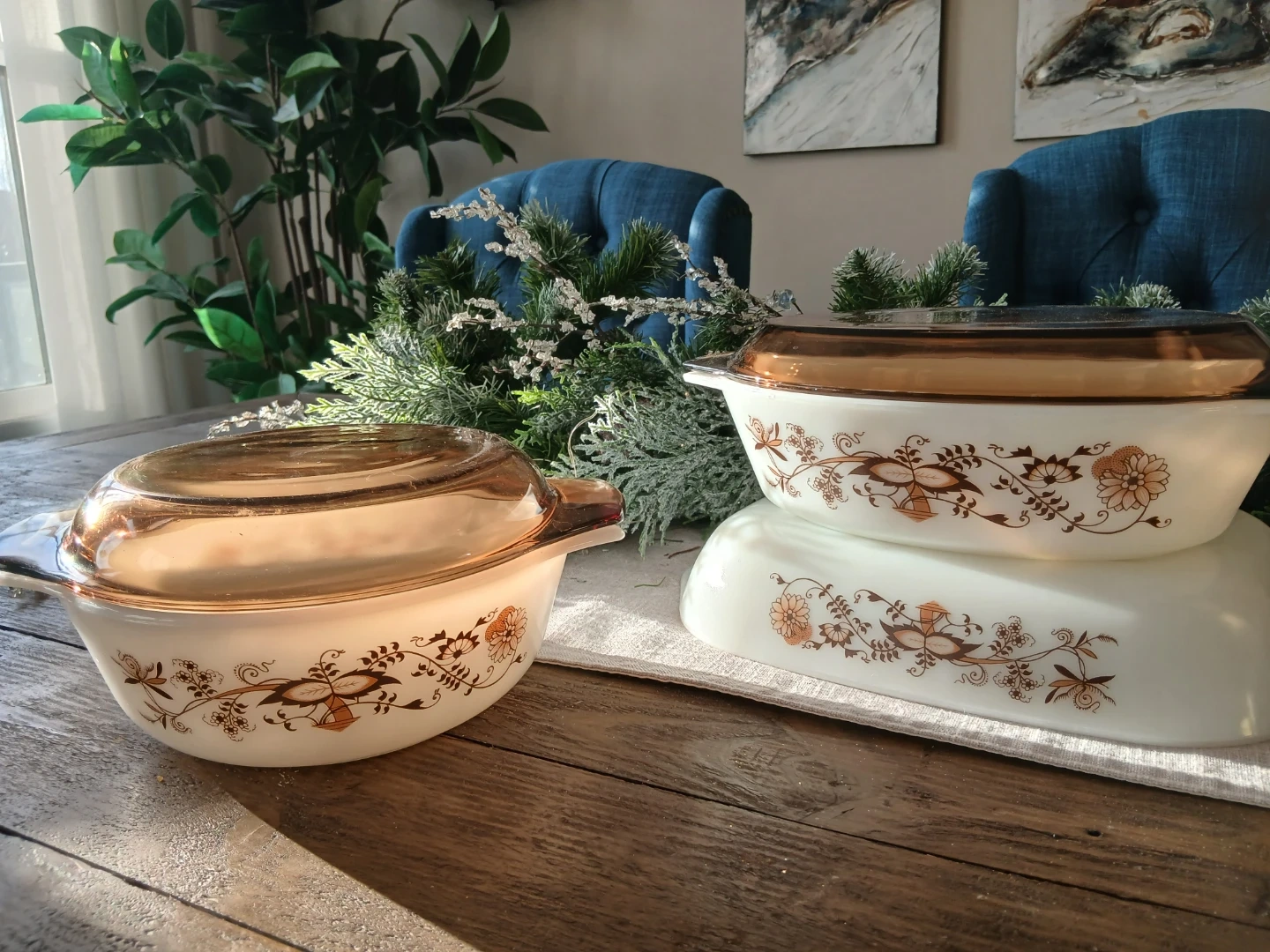 1970's Pyrex England Floral Vine 5PC Casserole Set with Smoky lids. EXCELLENT LIKE NEW CONDITION. This gorgeous collectible Bake set is HIGLY SAUGHT AFTER for retro kitchen decor. MCM Pick up Summerwood Subdivision Sherwood Park.