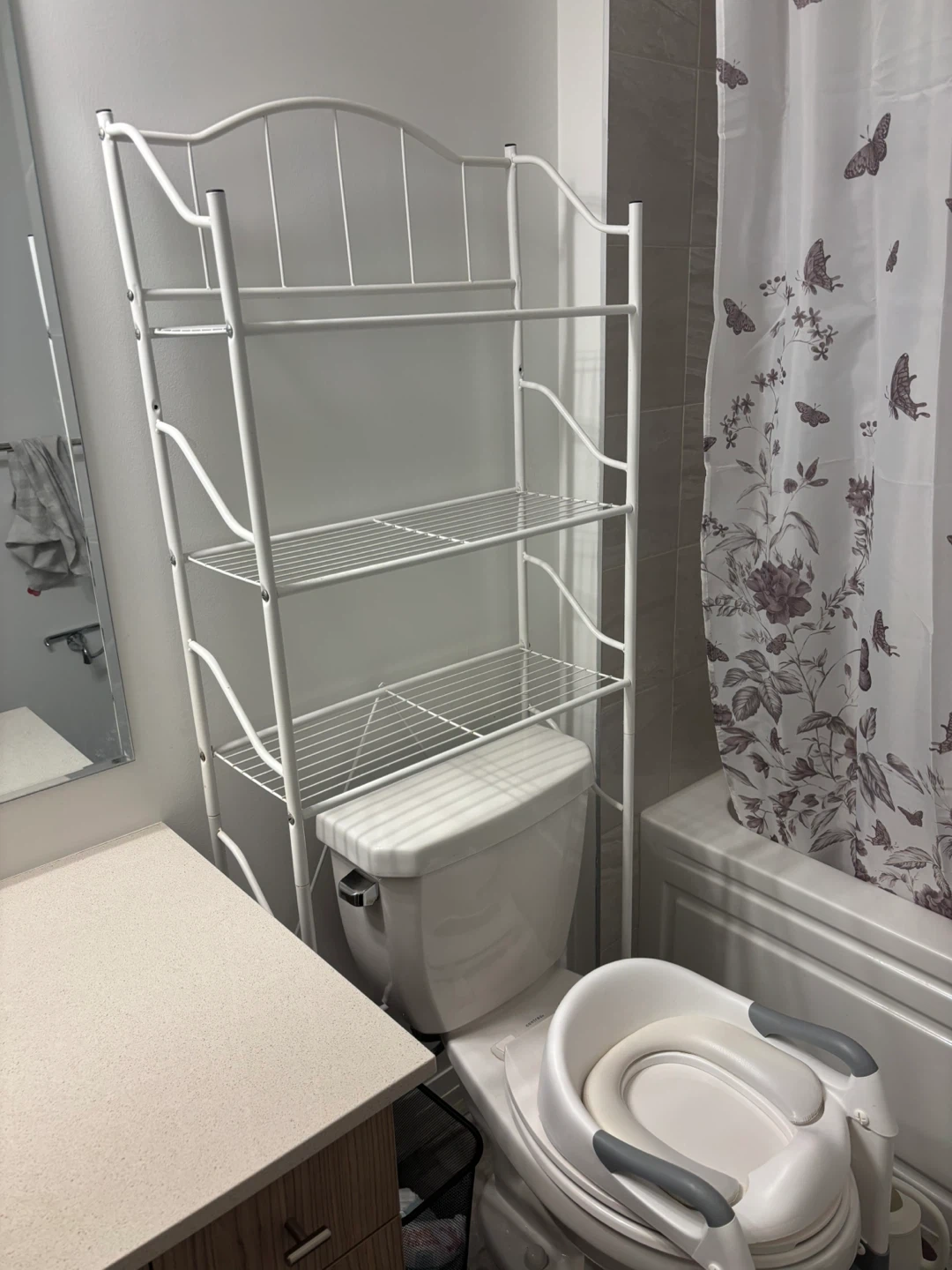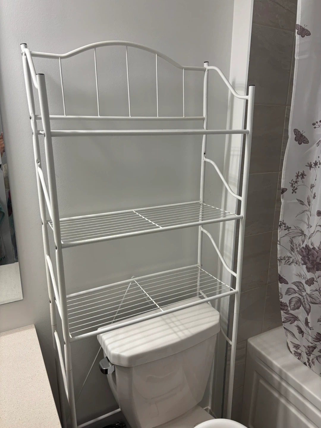 This white metal shelving unit is designed to fit over your toilet. It features three wire shelves for bathroom storage. This shelf is made of metal.