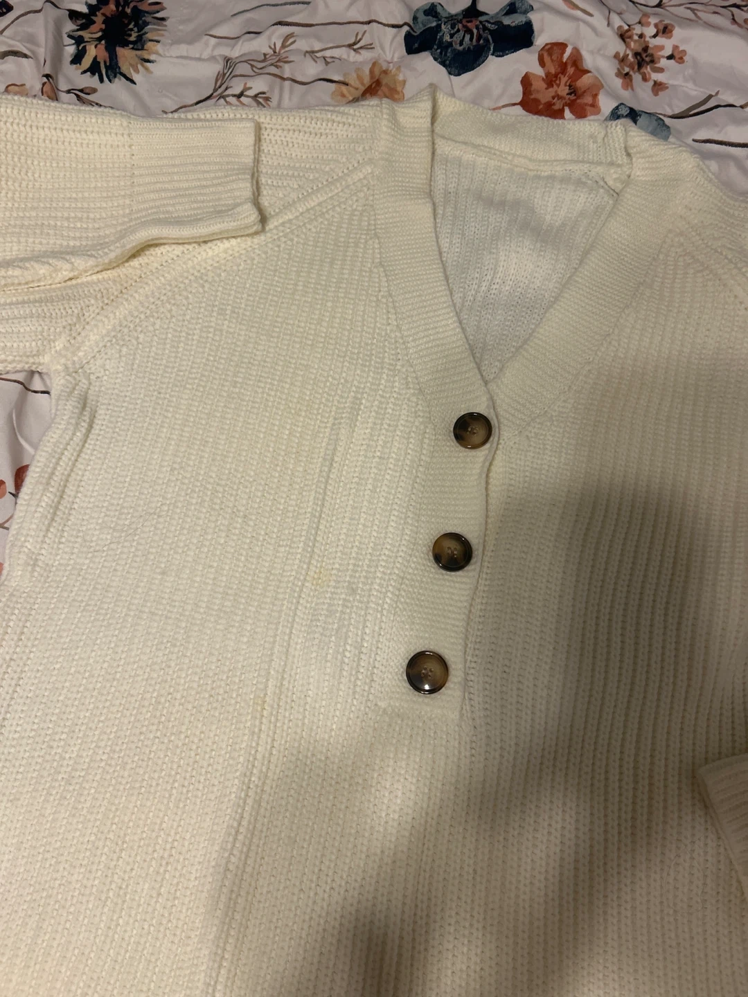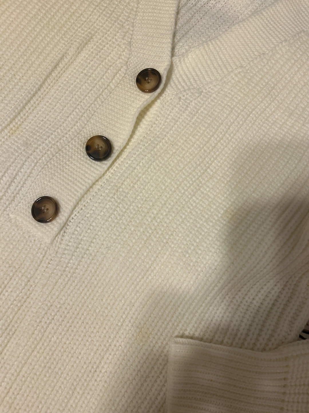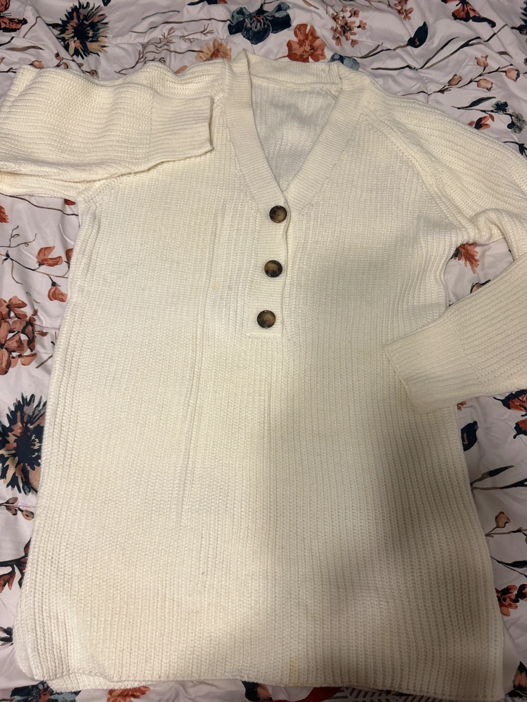 Cozy white ribbed knit sweater with a V-neck and three tortoise shell buttons. It's made of a soft, comfortable material, perfect for layering or wearing on its own. This sweater has a relaxed fit and long sleeves. its long and elastic can fit S M L
