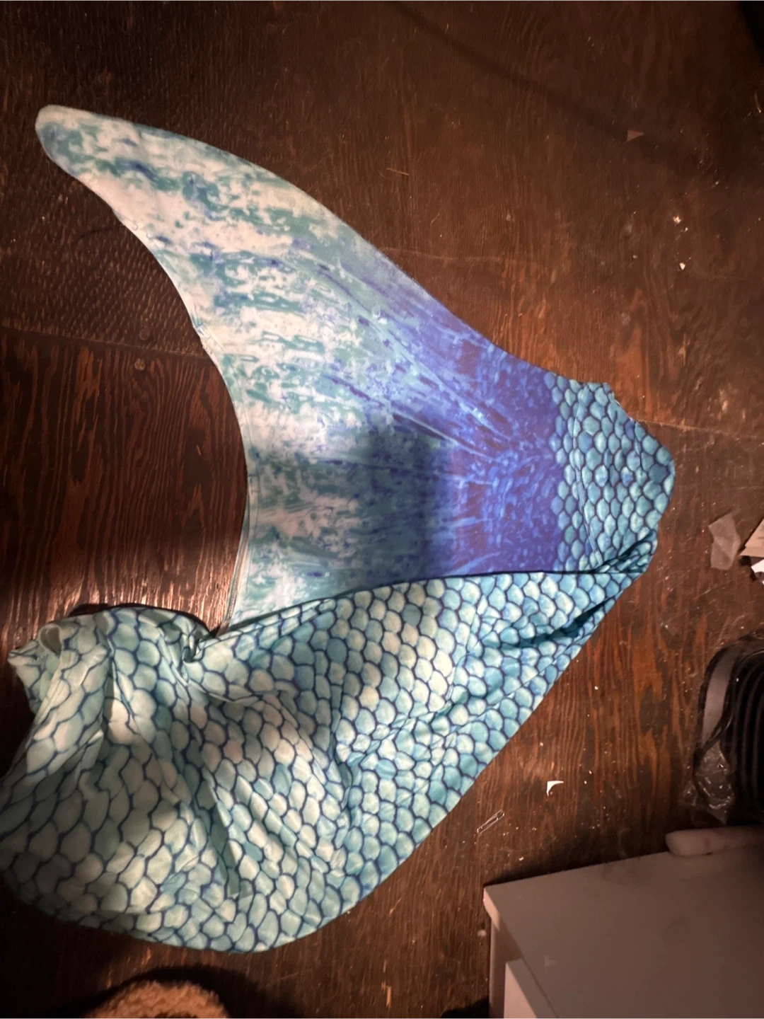 only used 3 or 4 times and has hard plastic fin with feet holes for a safe easy play in the water, can be taken off easily with Velcro to keep kids safe, and is a stretchy material!