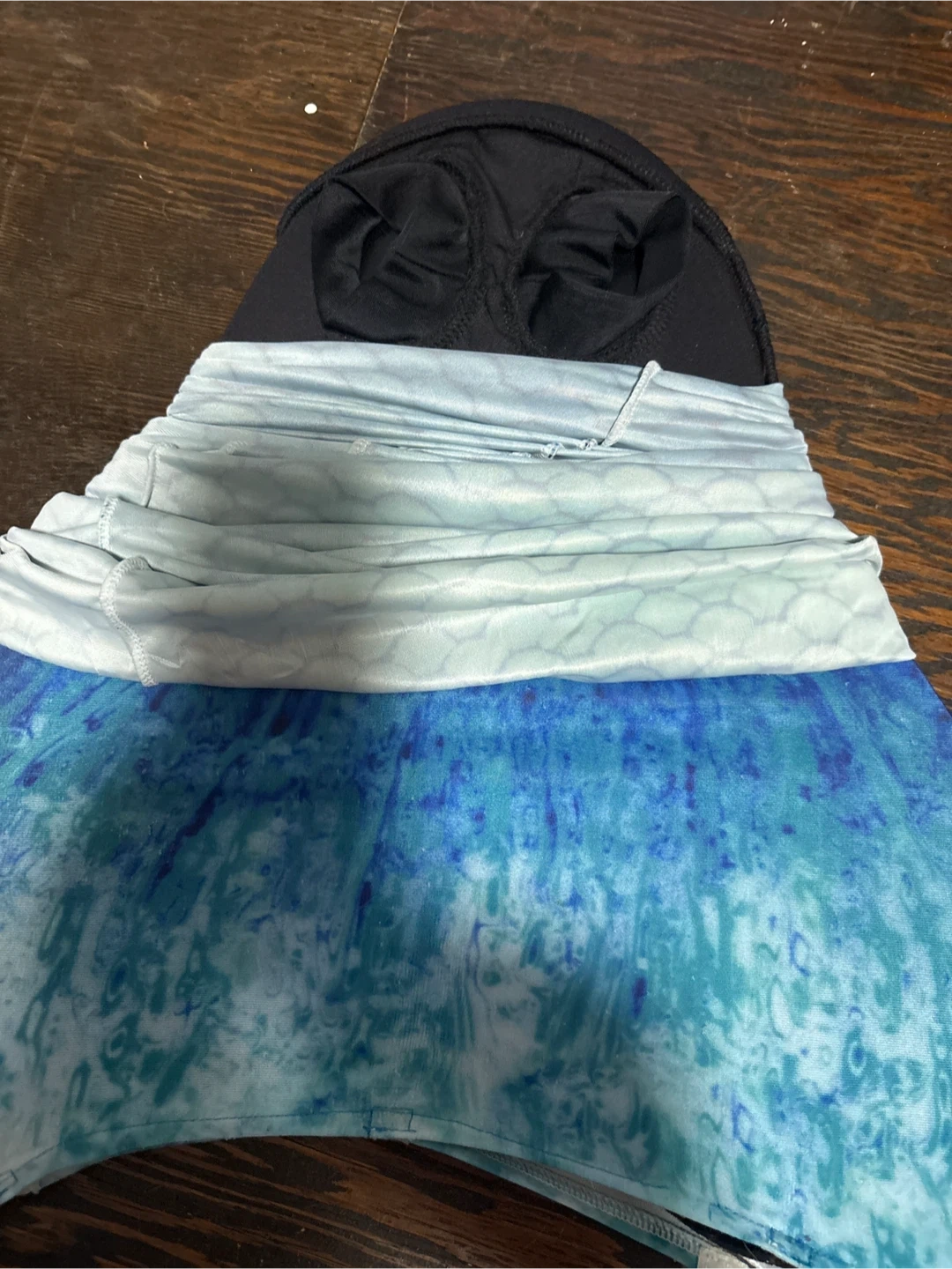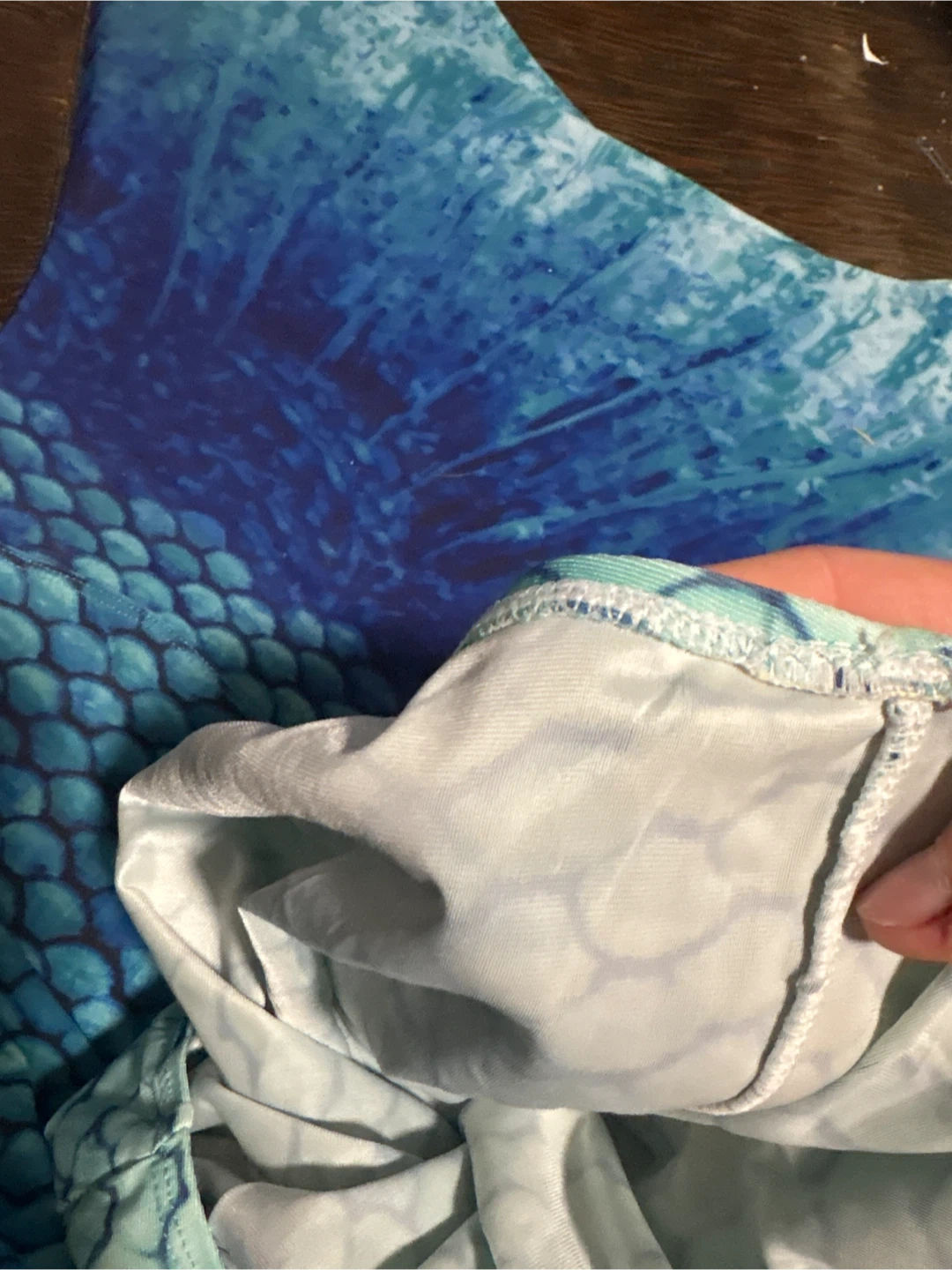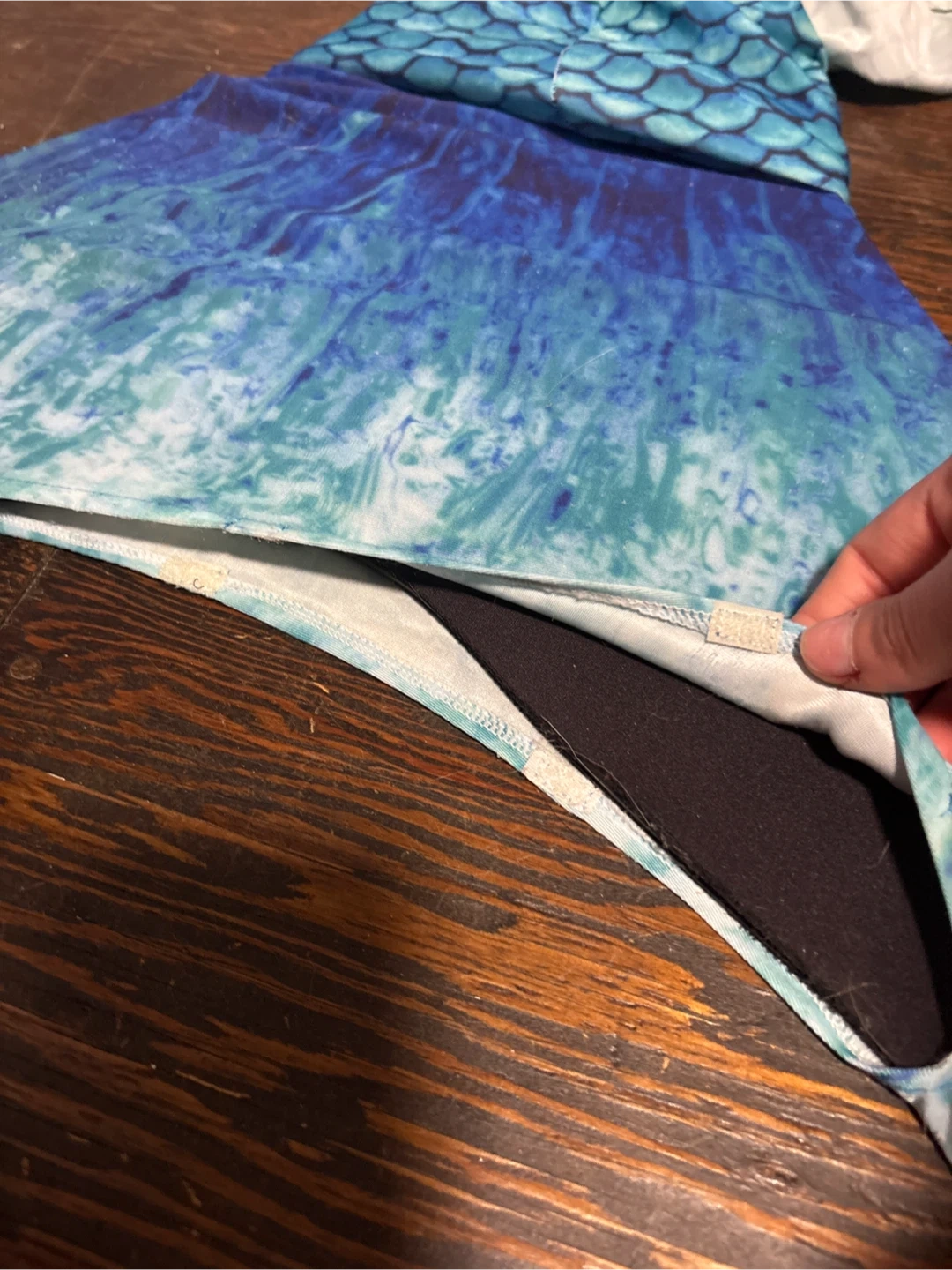 only used 3 or 4 times and has hard plastic fin with feet holes for a safe easy play in the water, can be taken off easily with Velcro to keep kids safe, and is a stretchy material!