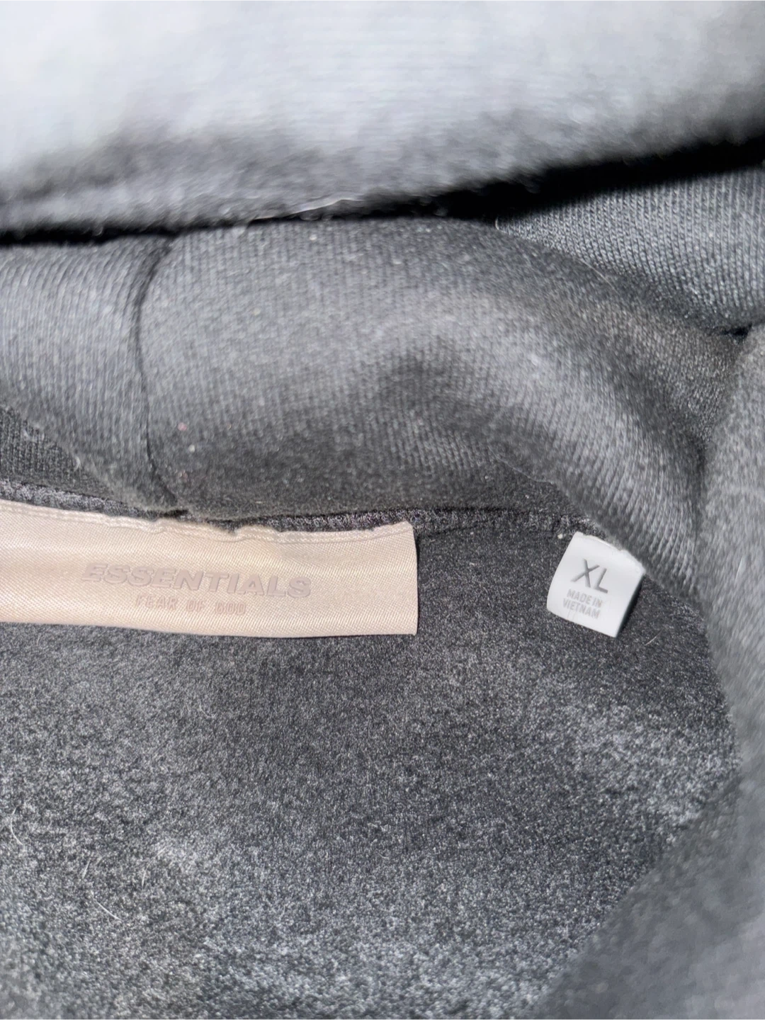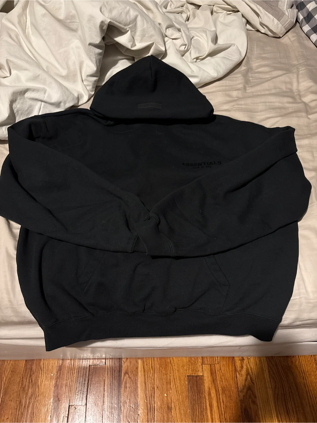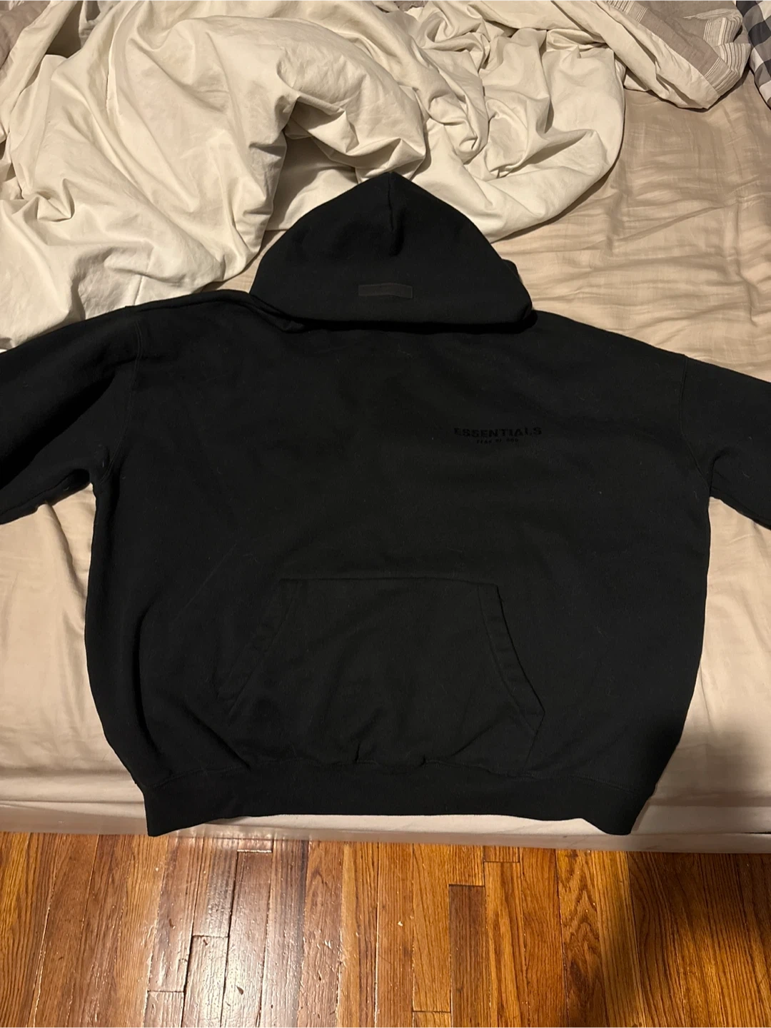 This is a black Fear of God Essentials hoodie in size XL. It has been worn once I accidentally ordered XL instead of large . ( brand new basically )
