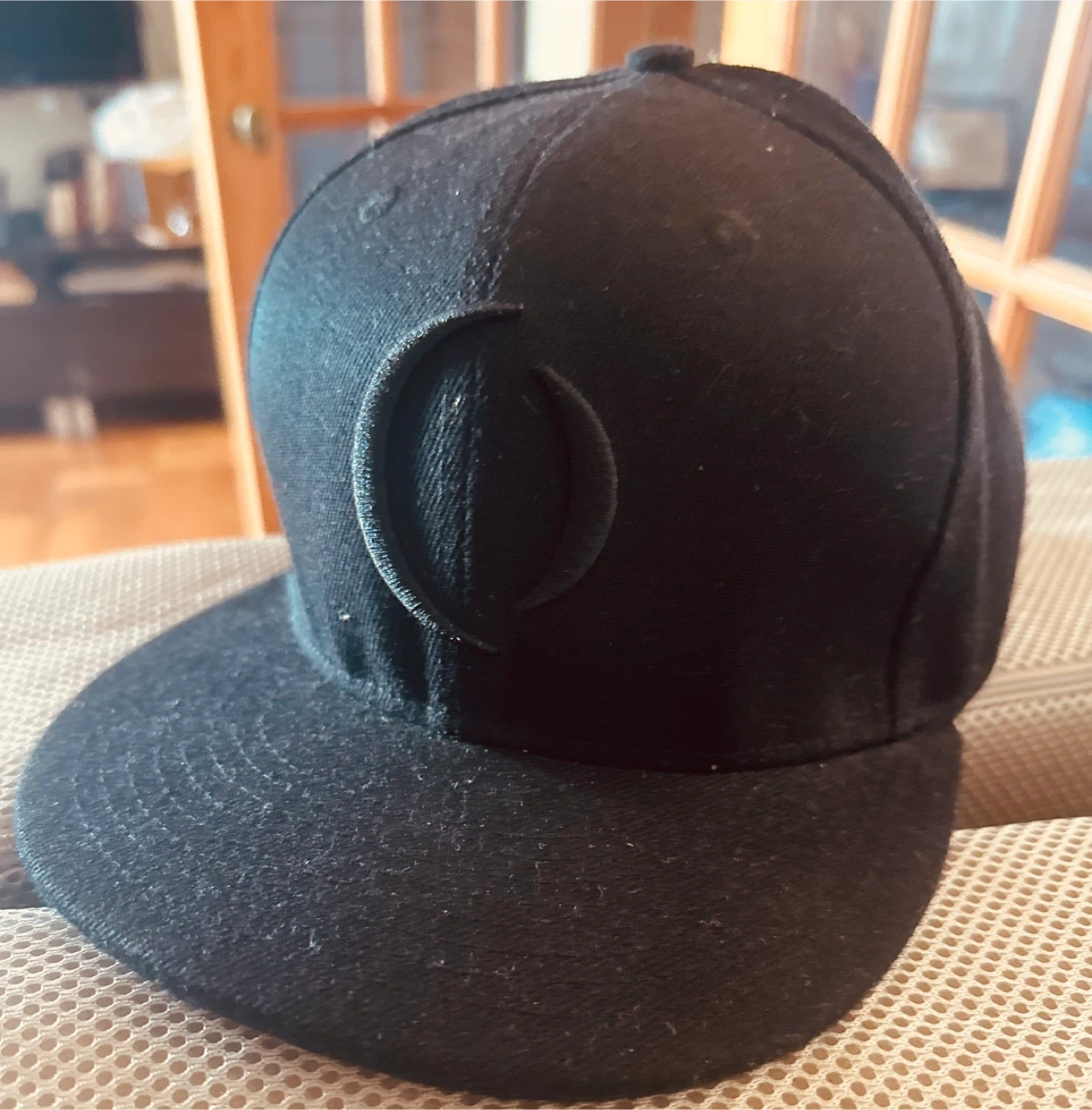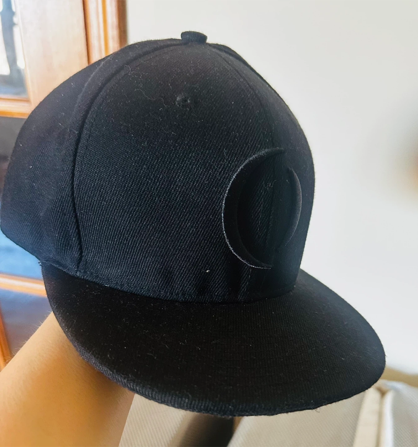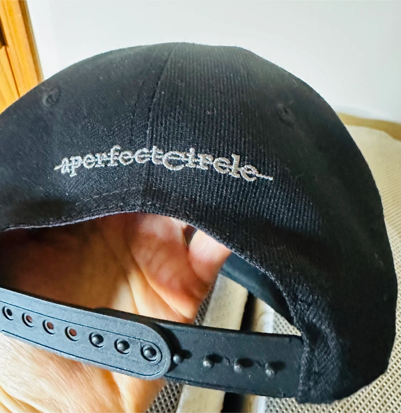 This is a black snapback hat with the A Perfect Circle logo embroidered on the front. The back of the hat has "a perfect circle" embroidered. It features an adjustable snap closure for a comfortable fit.