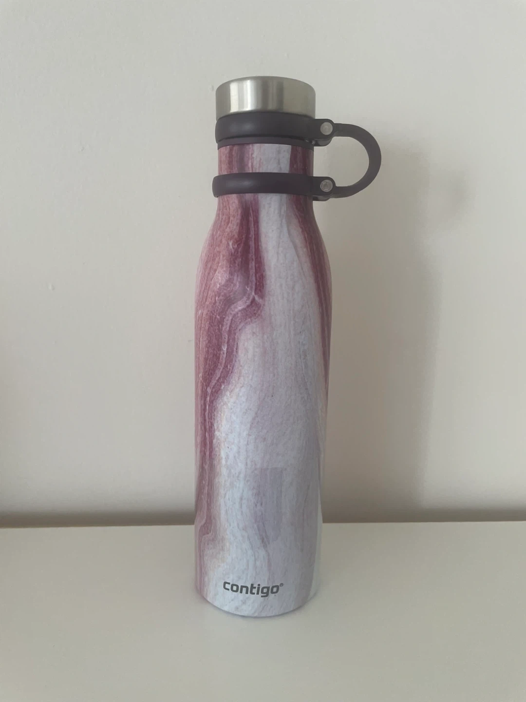 This Contigo water bottle features a stylish pink swirl design. It's BPA-free.