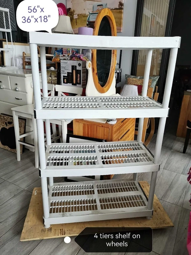 This used, 56" tall four-tier shelf, sized at 36"x18", provides ample storage with its sturdy construction and convenient wheels for easy mobility. Perfect for organizing any space, it's ready to roll into your home!
