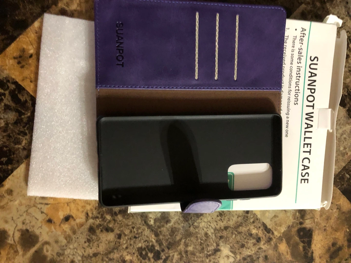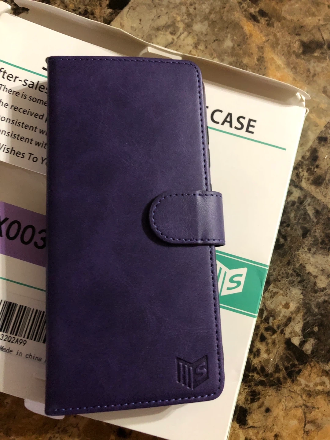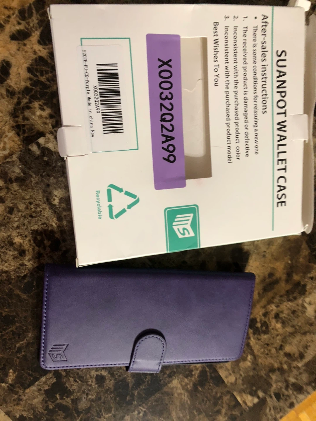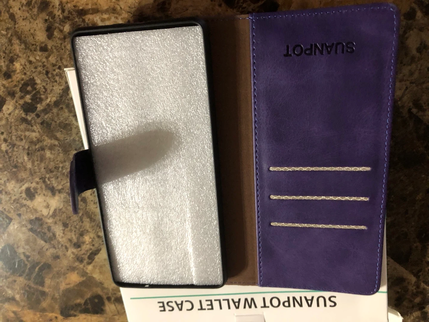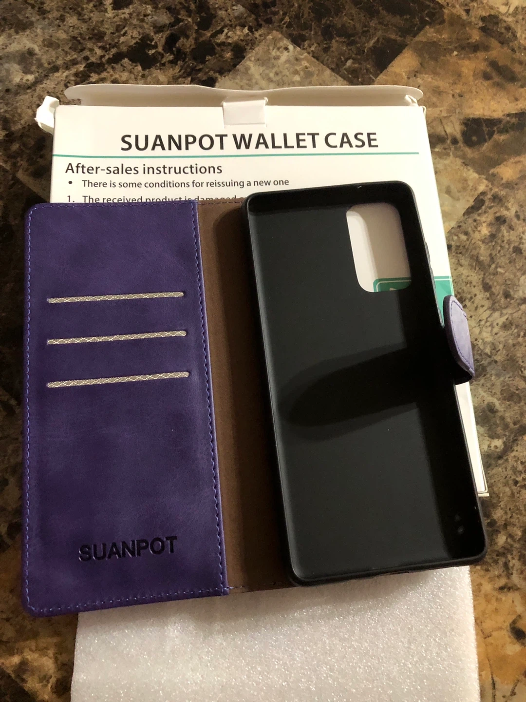 Selling a new SUANPOT S20 wallet case in purple. It's in great condition and comes with the box. Perfect for keeping your phone and cards together!