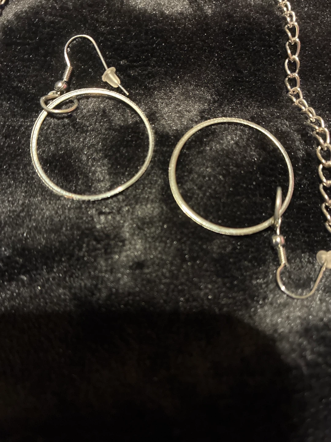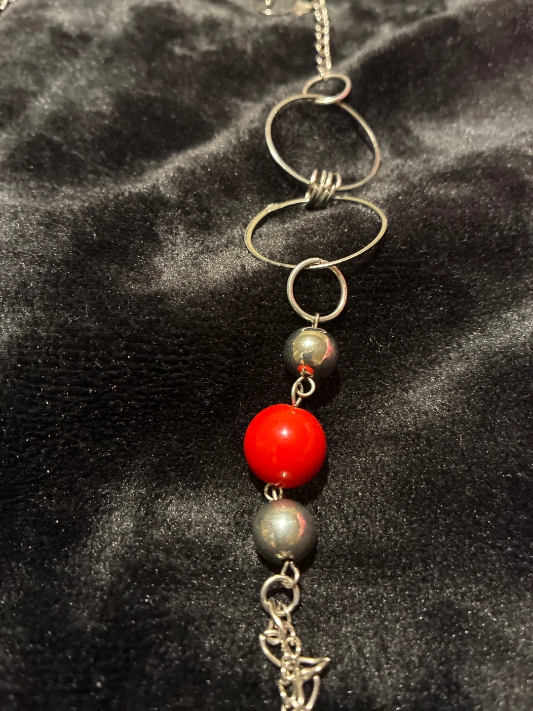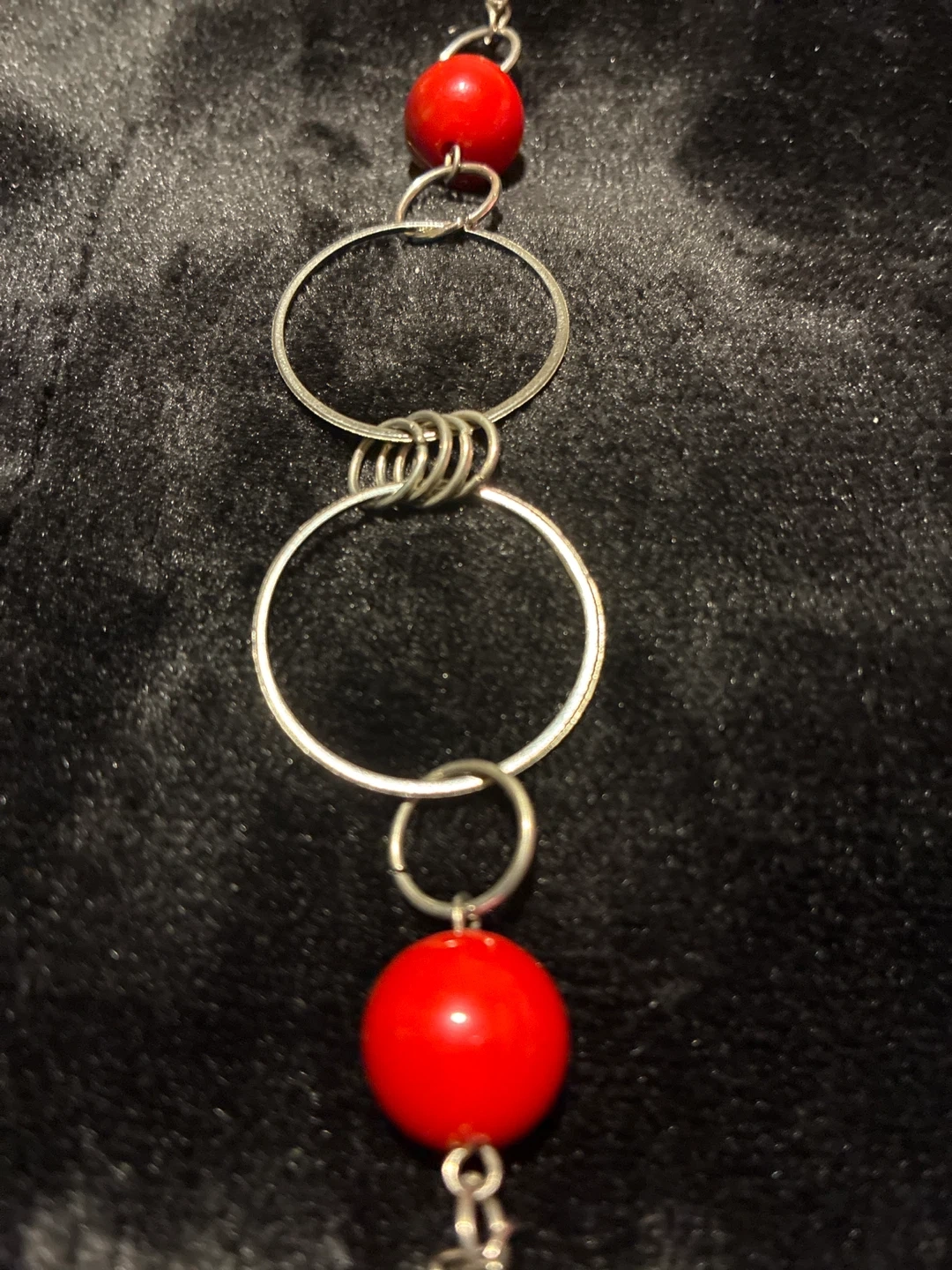 This jewelry set includes a silver-tone necklace with red beads and interlocking rings. It also comes with a pair of matching hoop earrings. The necklace has a delicate chain design. This set is great for adding a pop of color to any outfit!