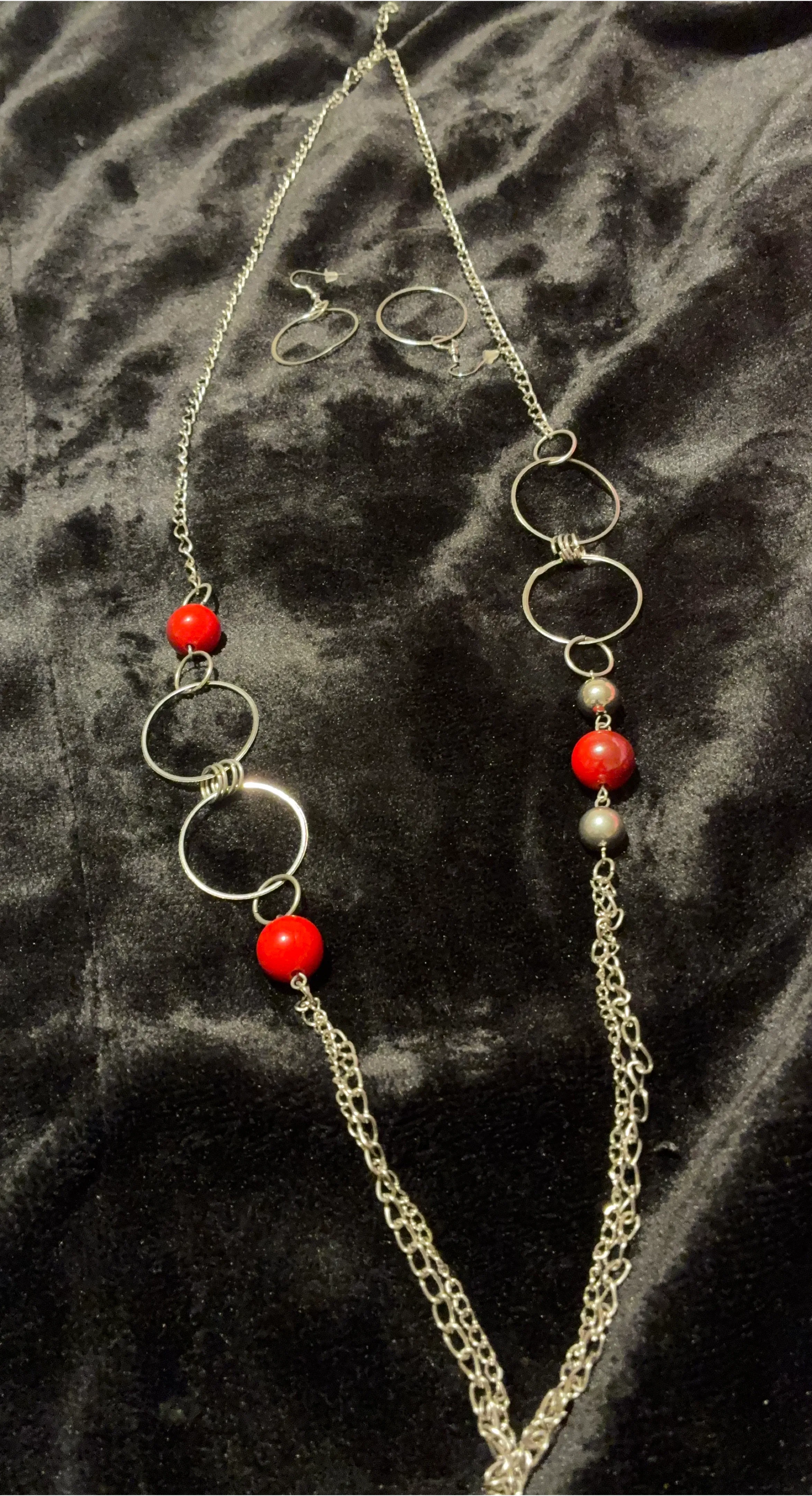 This jewelry set includes a silver-tone necklace with red beads and interlocking rings. It also comes with a pair of matching hoop earrings. The necklace has a delicate chain design. This set is great for adding a pop of color to any outfit!