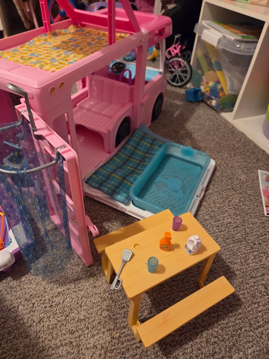 Pink Barbie camper van playset with opening sides and accessories. Includes miniature picnic table, grill, and cups. Perfect for imaginative play!
