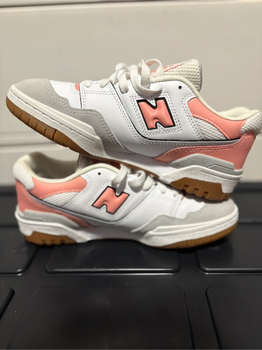 Get these classic New Balance 550 sneakers in a clean white, coral, and grey colourway. They're made with a mix of leather and suede for a durable and stylish feel. These shoes are perfect for everyday wear!