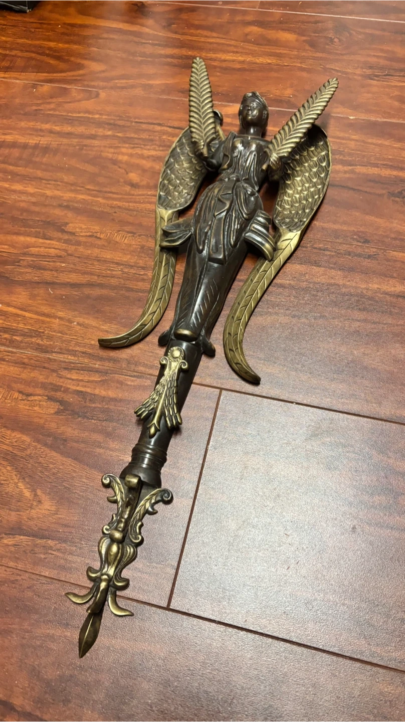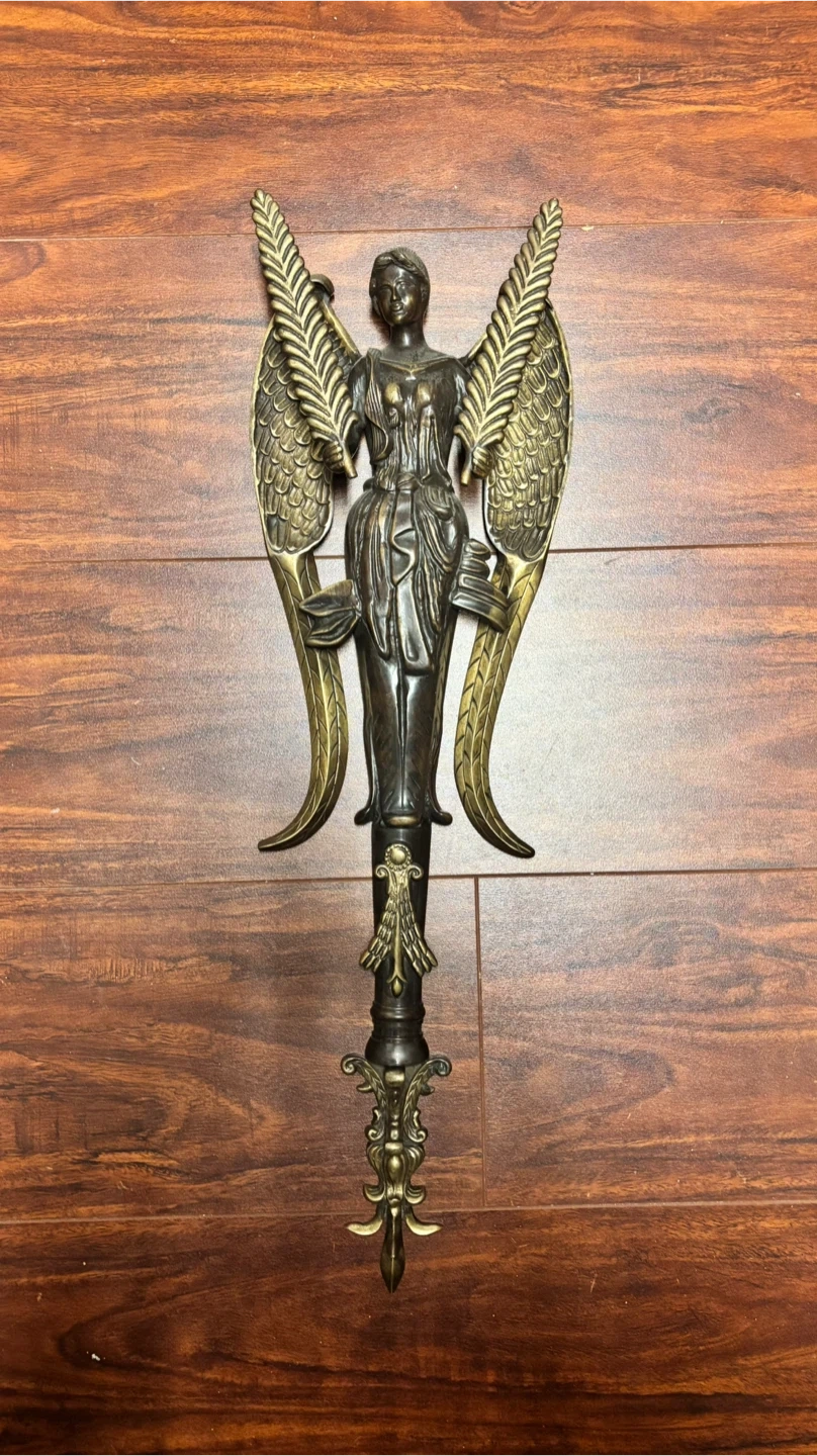 This decorative wall sconce features an angel figurine with outstretched wings. It's made of metal with a bronze-like finish. This piece would add an elegant touch to any room's decor.