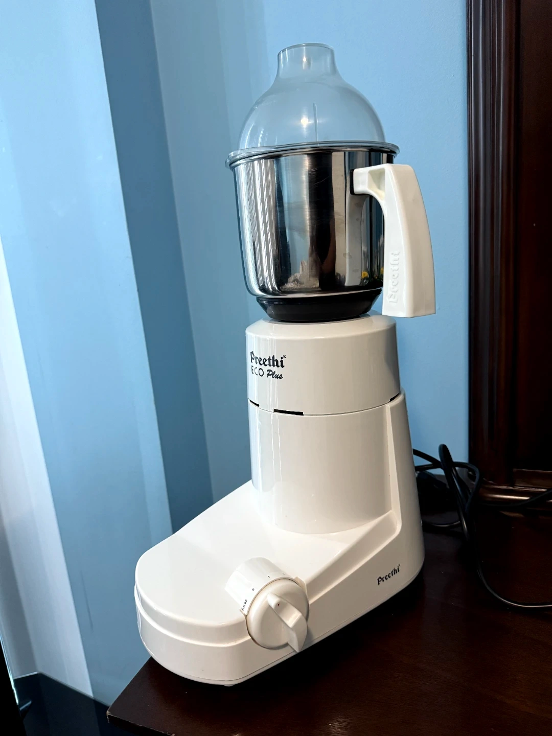 Preethi ECO Plus mixer grinder with a stainless steel jar. It features a pulse function for controlled blending. This appliance is great for everyday kitchen tasks. Used only a very few times as I opted for tiffin service.