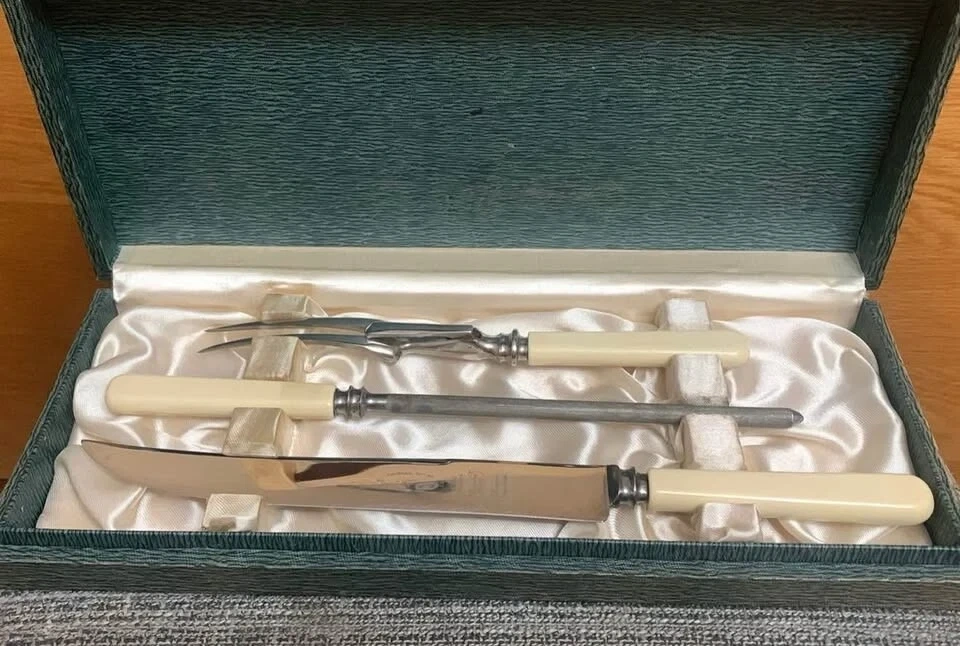 Here's a lovely vintage carving set by Robert F. Wilding & Co. of Sheffield. The set includes a carving knife, fork, and sharpening steel, all nestled in their original box. The blades are made of hand-ground stainless steel and are marked as Made in England.