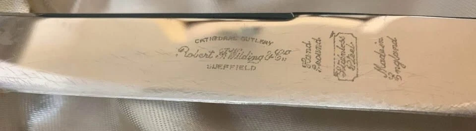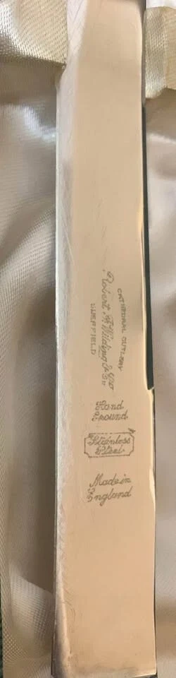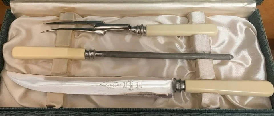 Here's a lovely vintage carving set by Robert F. Wilding & Co. of Sheffield. The set includes a carving knife, fork, and sharpening steel, all nestled in their original box. The blades are made of hand-ground stainless steel and are marked as Made in England.