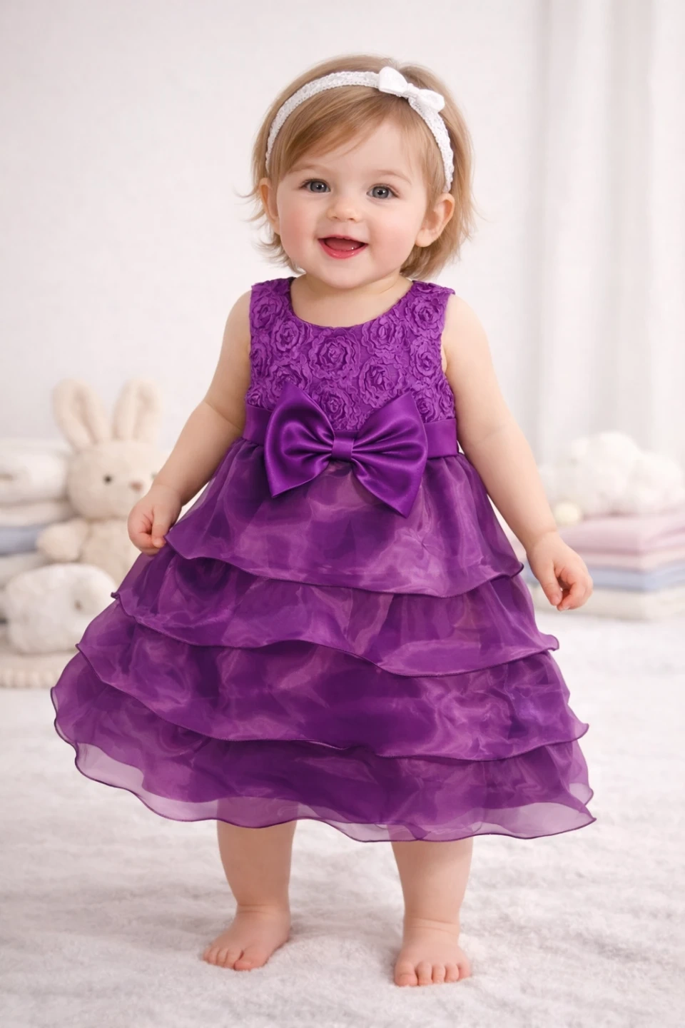 Adorable sleeveless purple dress. Features a textured floral bodice with a satin bow at the waist. The skirt has tiered ruffles for a fuller look. Comes with a tie sash at the back. Perfect for special occasions!