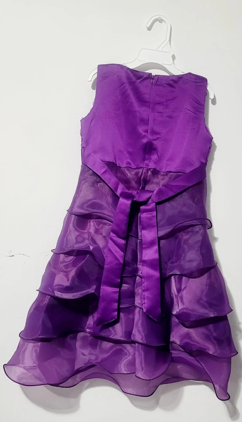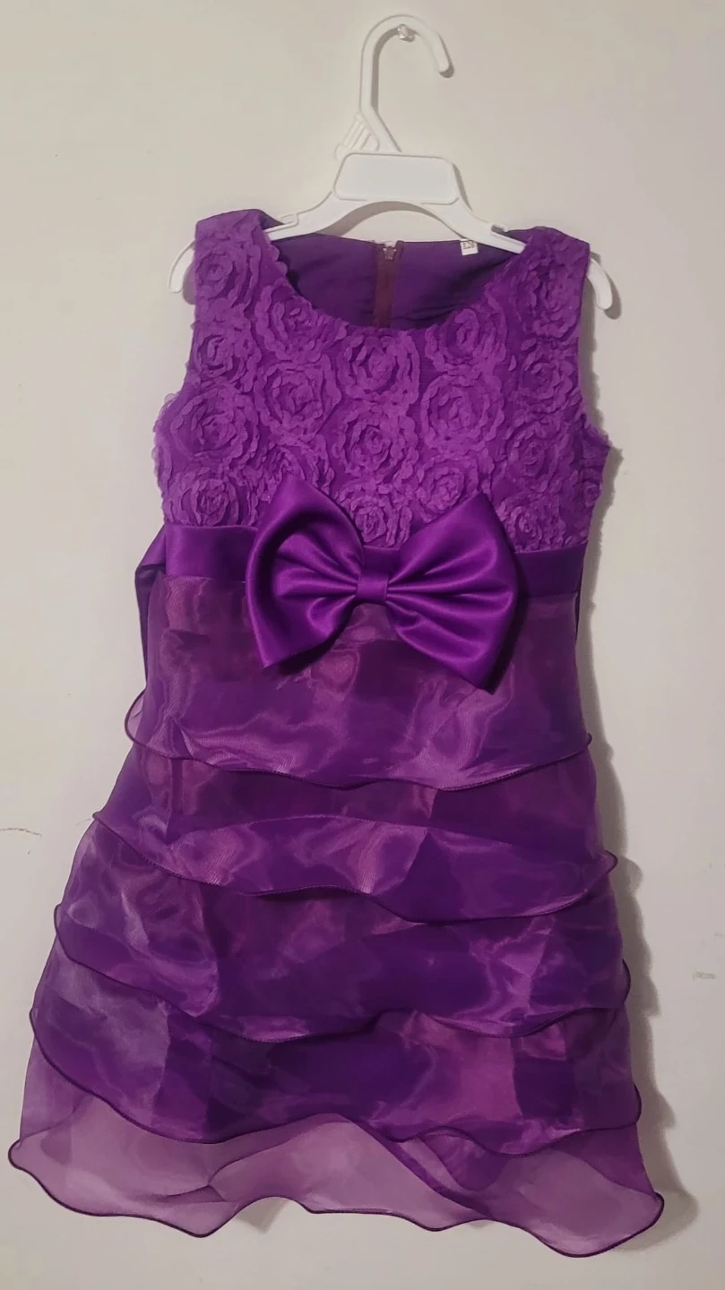 Adorable sleeveless purple dress. Features a textured floral bodice with a satin bow at the waist. The skirt has tiered ruffles for a fuller look. Comes with a tie sash at the back. Perfect for special occasions!