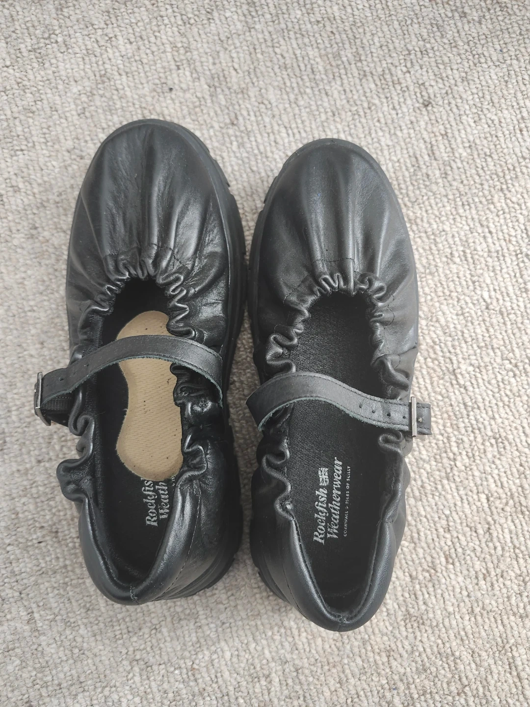 Black Mary Jane style shoes from Rockfish Weatherwear. They're made of leather with adjustable buckle straps. Perfect for everyday wear!