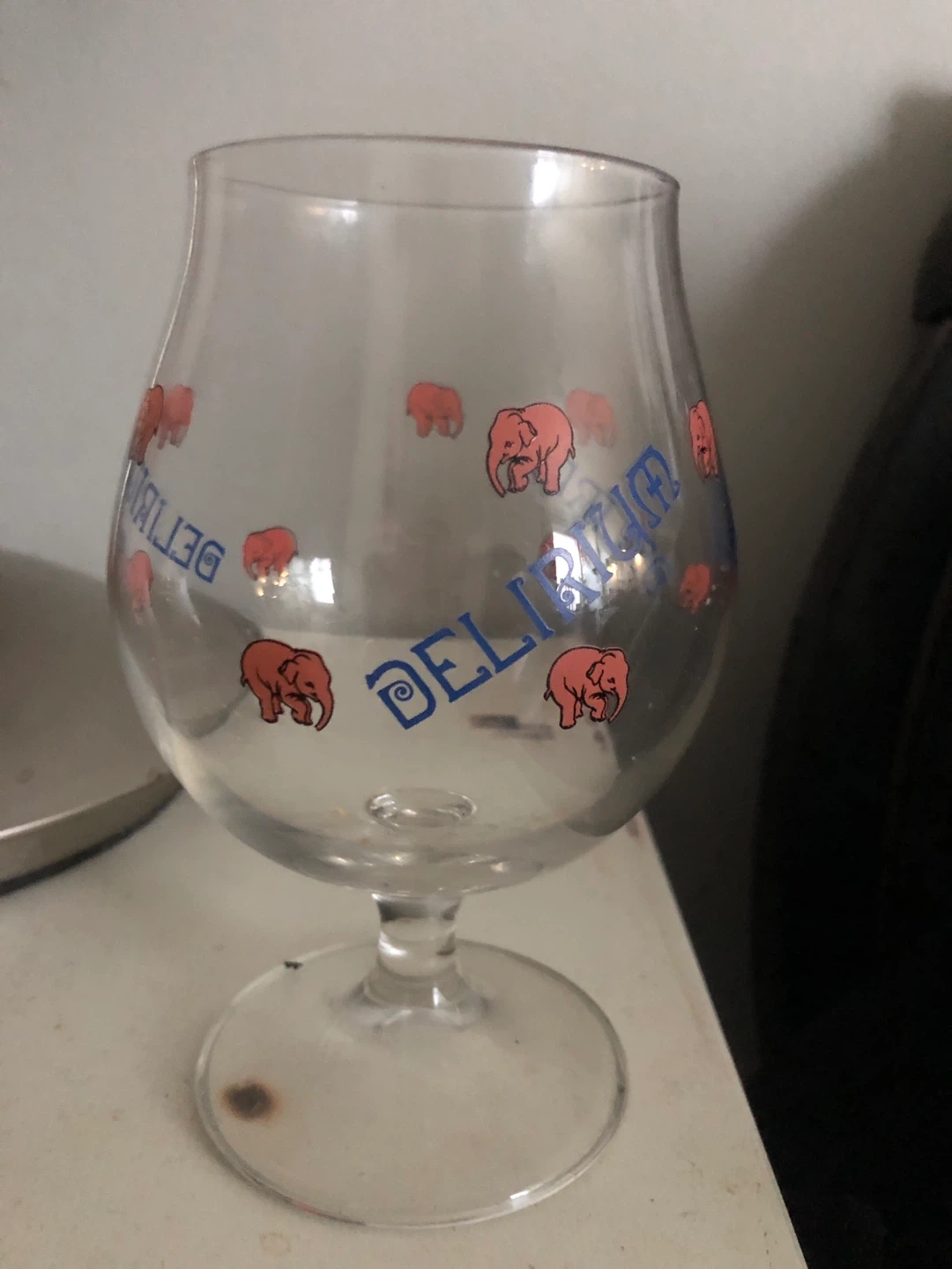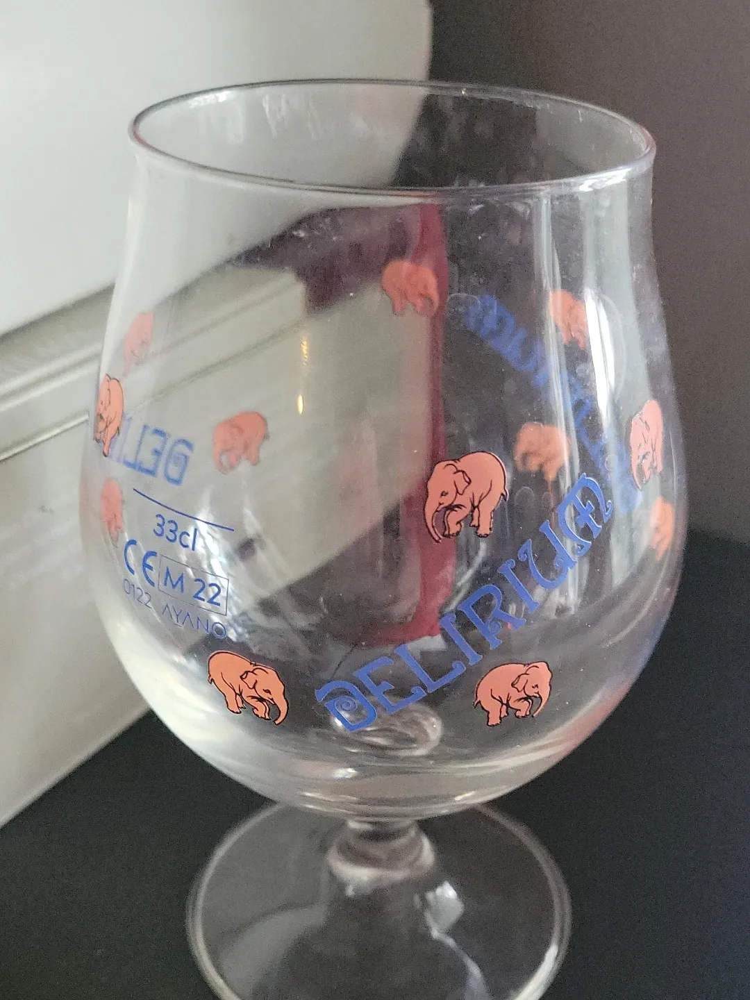 This is a Delirium Tremens beer glass. It's a 33cl tulip-shaped glass, ideal for enjoying your favourite Belgian beers. The glass features the iconic pink elephants and blue branding. It's made of clear glass.