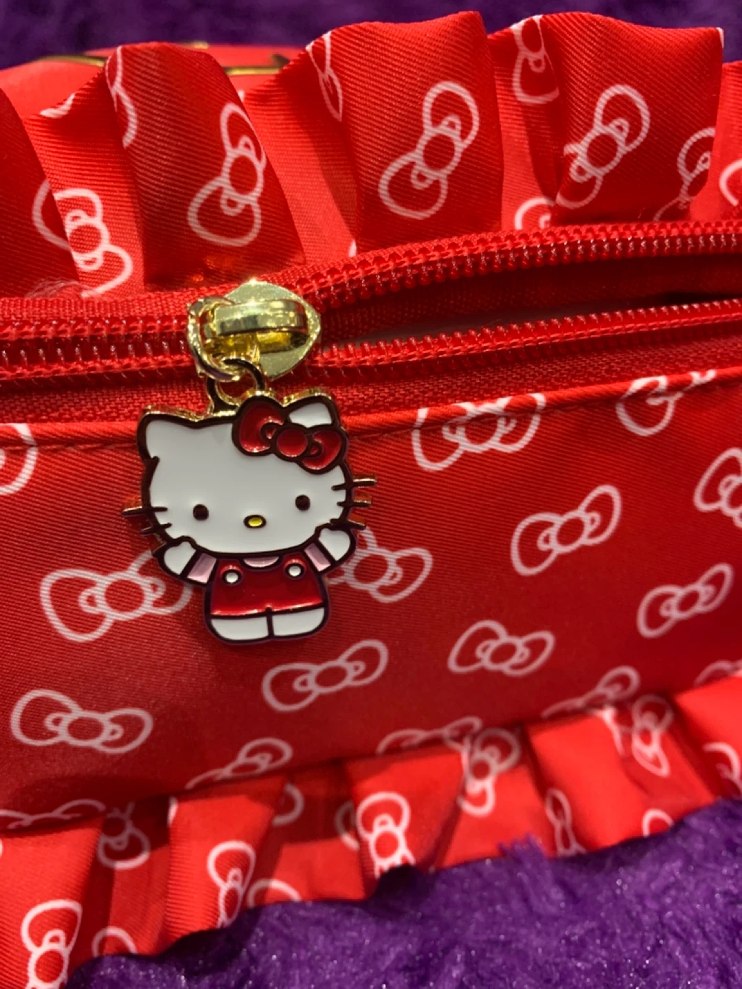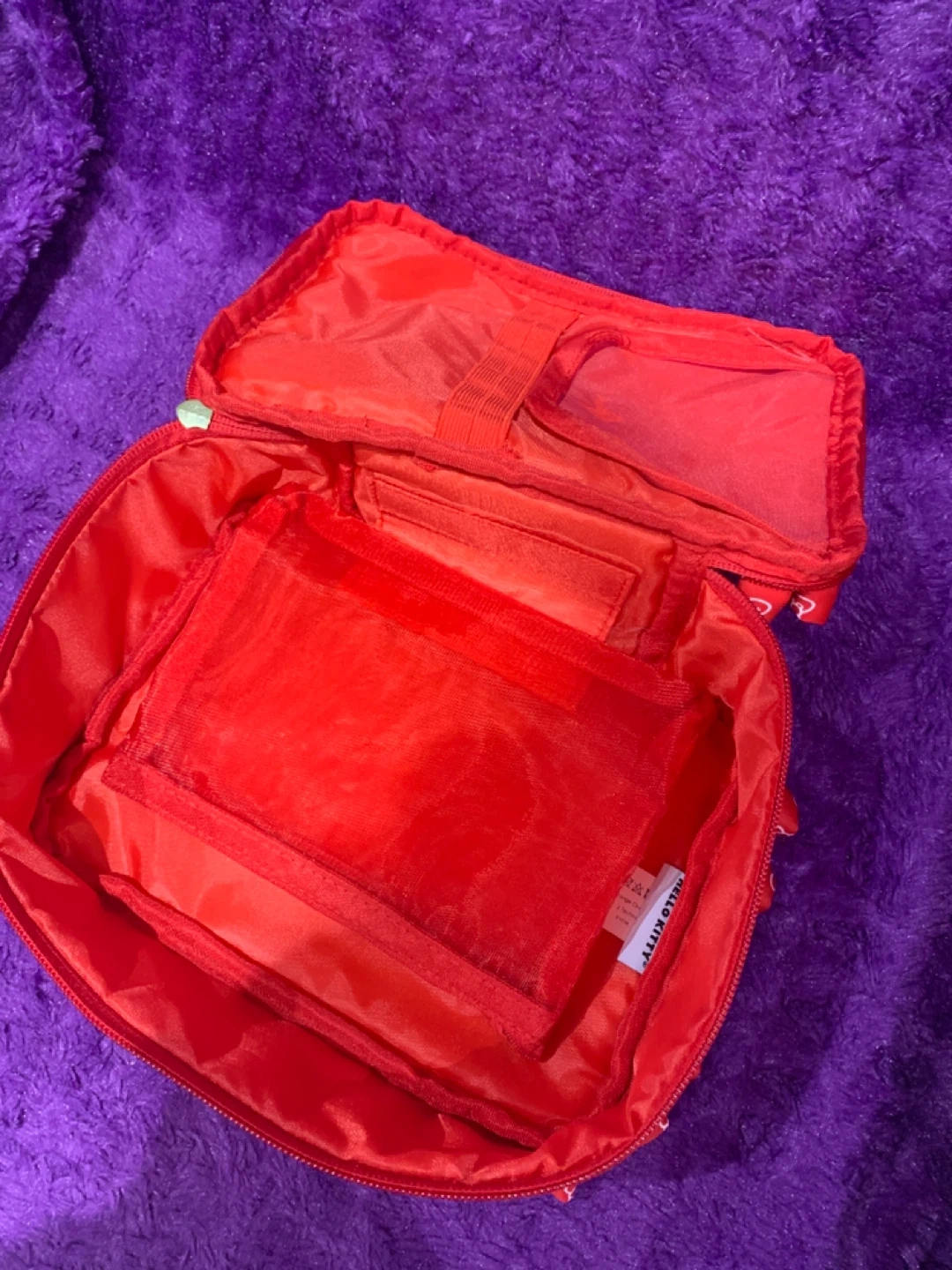 This is a cute red Hello Kitty cosmetic bag. It features a patterned exterior with bows and Hello Kitty graphics. The interior has multiple compartments and an elastic strap. The zipper pull has a Hello Kitty charm.