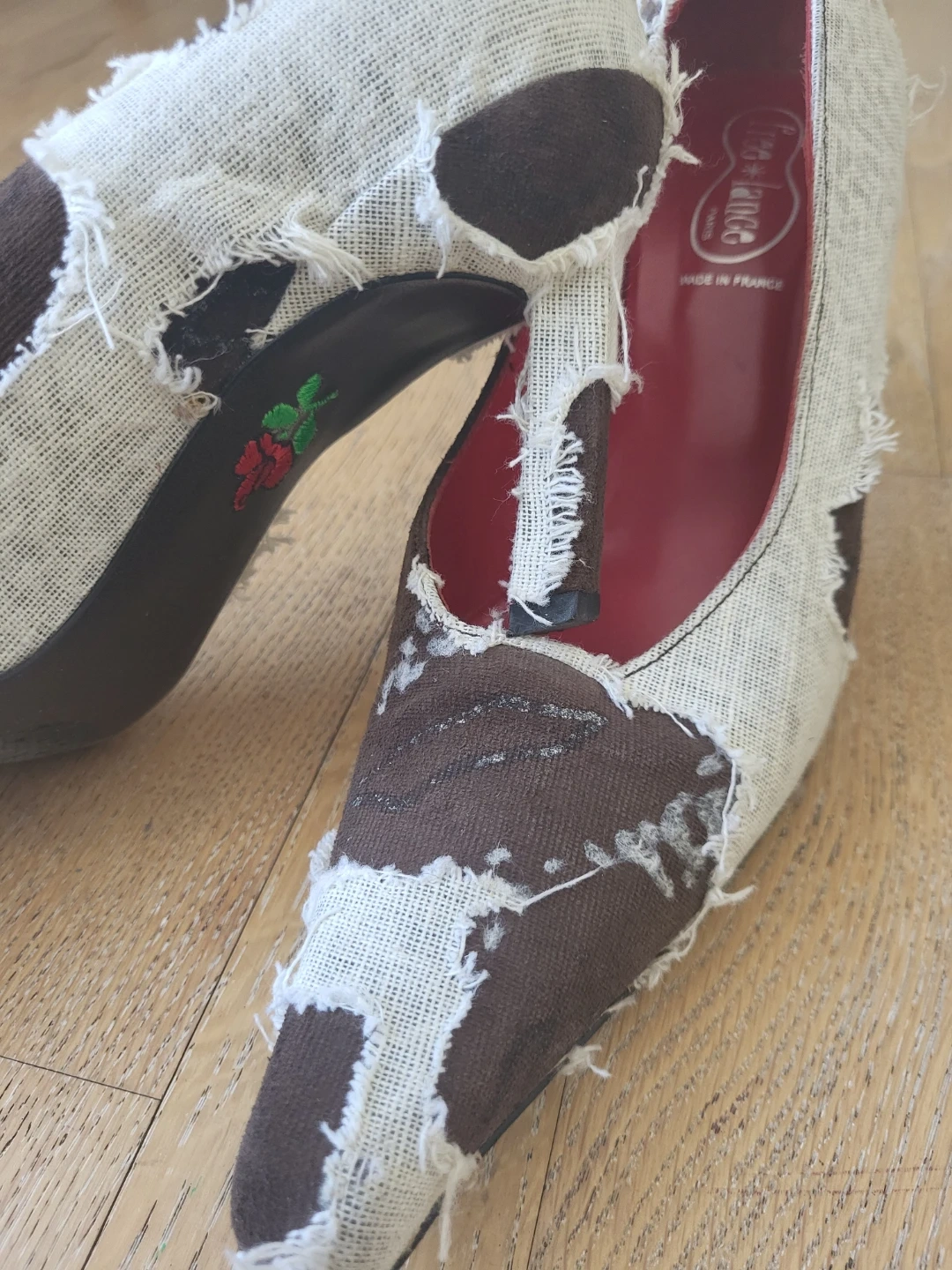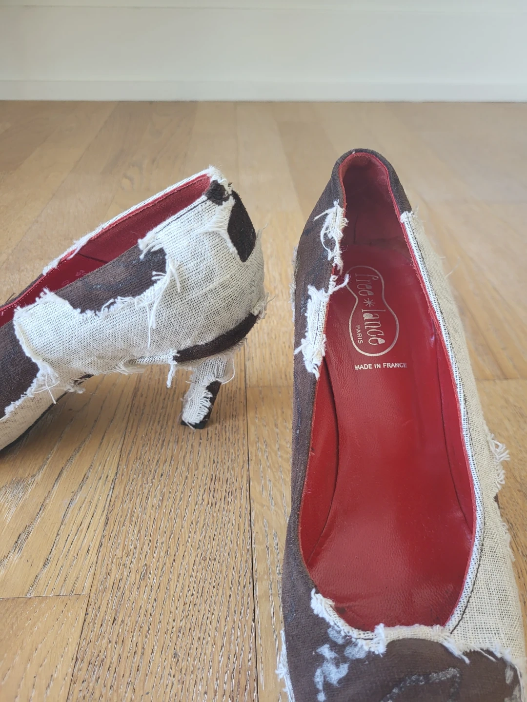 These are women's heels from Free Lance Paris. They are made in France. The shoes have a unique distressed fabric design in brown and white with a red interior.