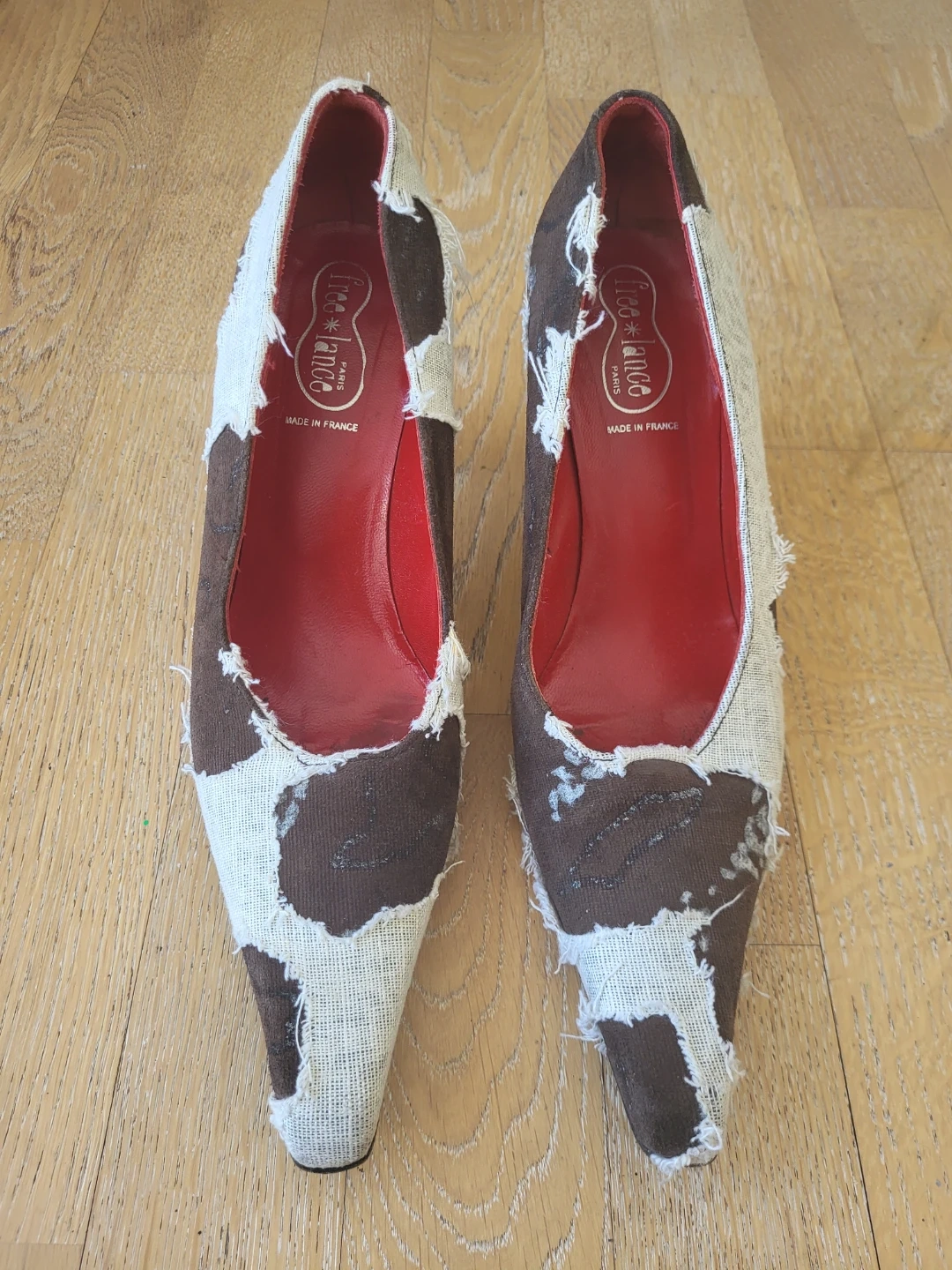 These are women's heels from Free Lance Paris. They are made in France. The shoes have a unique distressed fabric design in brown and white with a red interior.