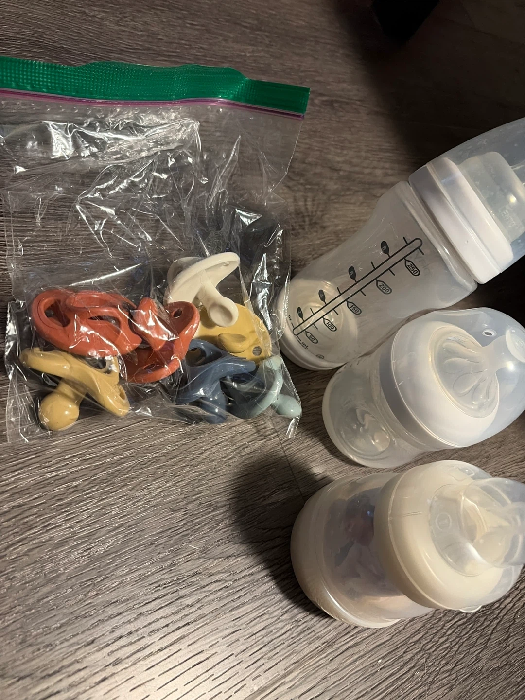 Includes three baby bottles and a bag of assorted pacifiers. Bottles have measurement markings up to 250ml. Pacifiers are in various colours. Got an abundance of bottles and according to my lactation help; these are not the right soothers. Just trying to buy the right ones. All have been sanitized.
