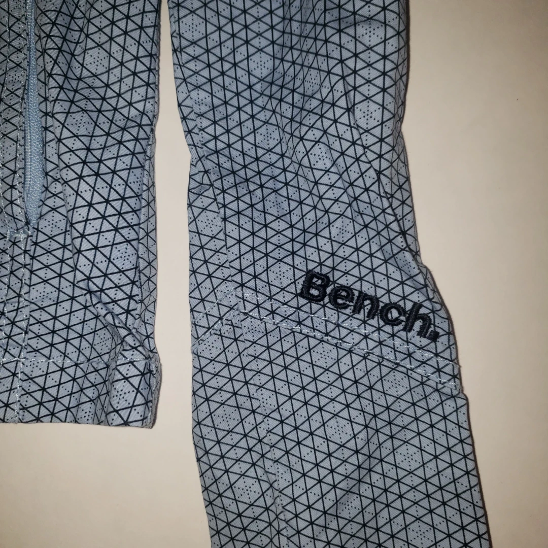 kids Bench jacket Light blue and black colour with a geometric pattern. Full zipper closure and two front pockets. Features a stand-up collar. Long sleeves.