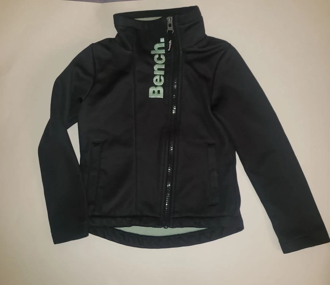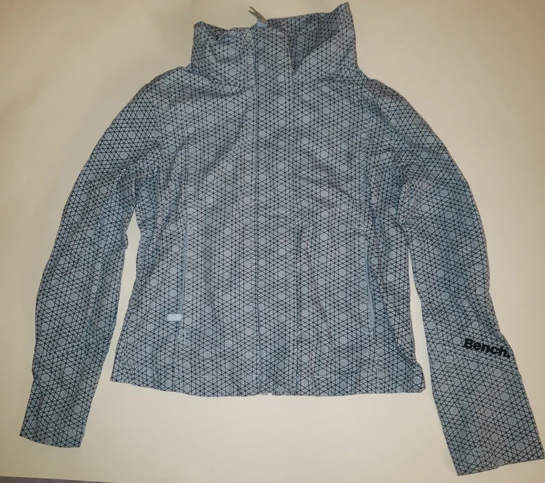 kids Bench jacket Light blue and black colour with a geometric pattern. Full zipper closure and two front pockets. Features a stand-up collar. Long sleeves.