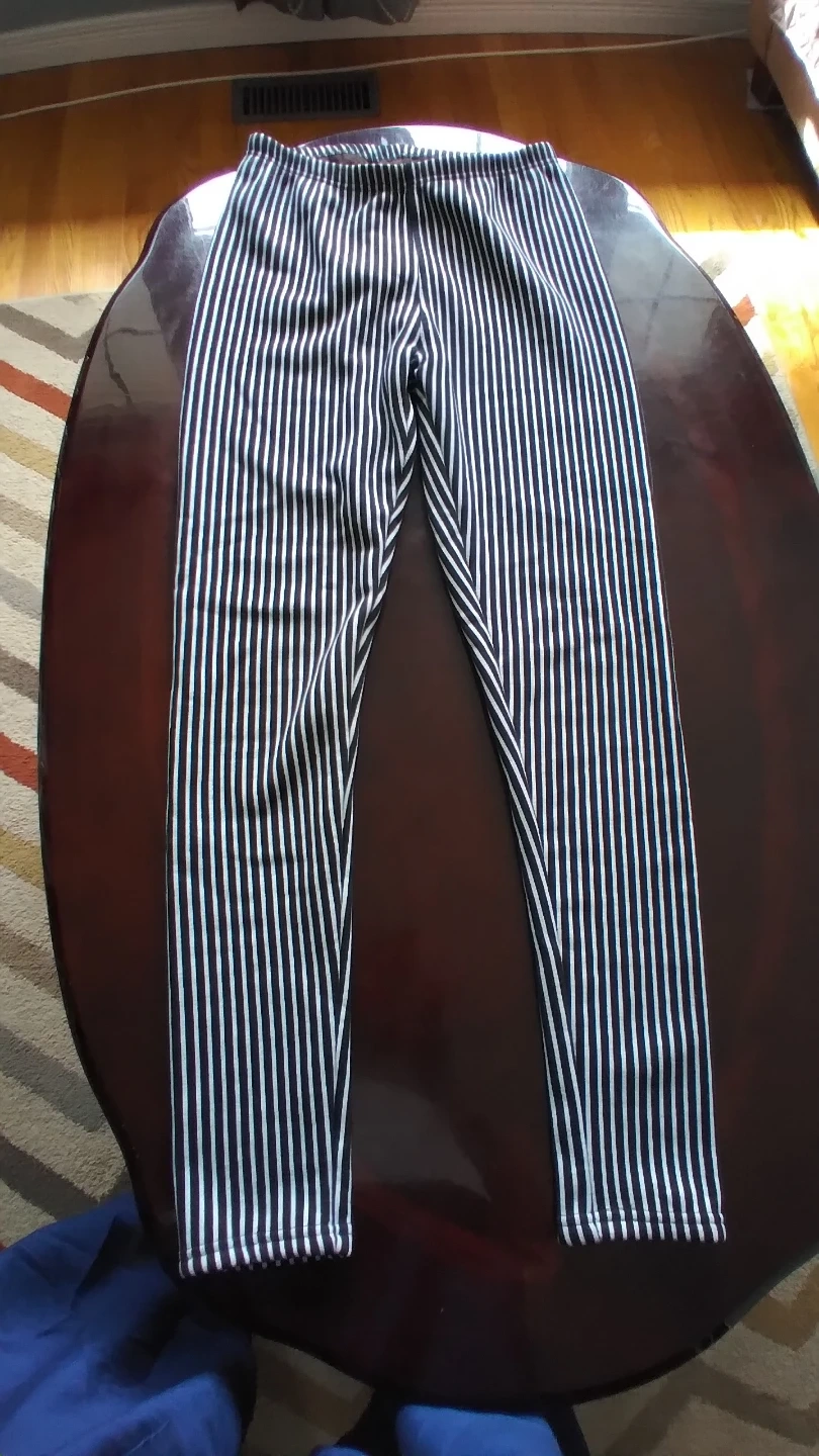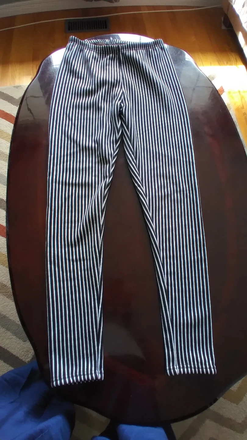 Cozy fleece-lined leggings with a black and white vertical stripe pattern. Made from a blend of 90% polyester and 10% spandex for a comfortable stretch. Perfect for staying warm on cooler days!